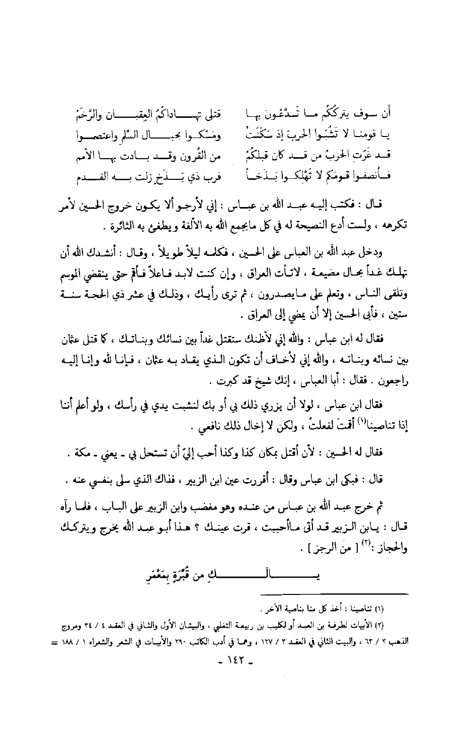 ثم خرج عبد الله بن عباس من عنده وهو مغضب وابن الزبير على الباب، فلما رآه قال: يا بن الزبير قد أتى ما أحببت، قرت عينك؟ هذا أبو عبد الله يخرج ويتركك والحجاز: من الرجز.