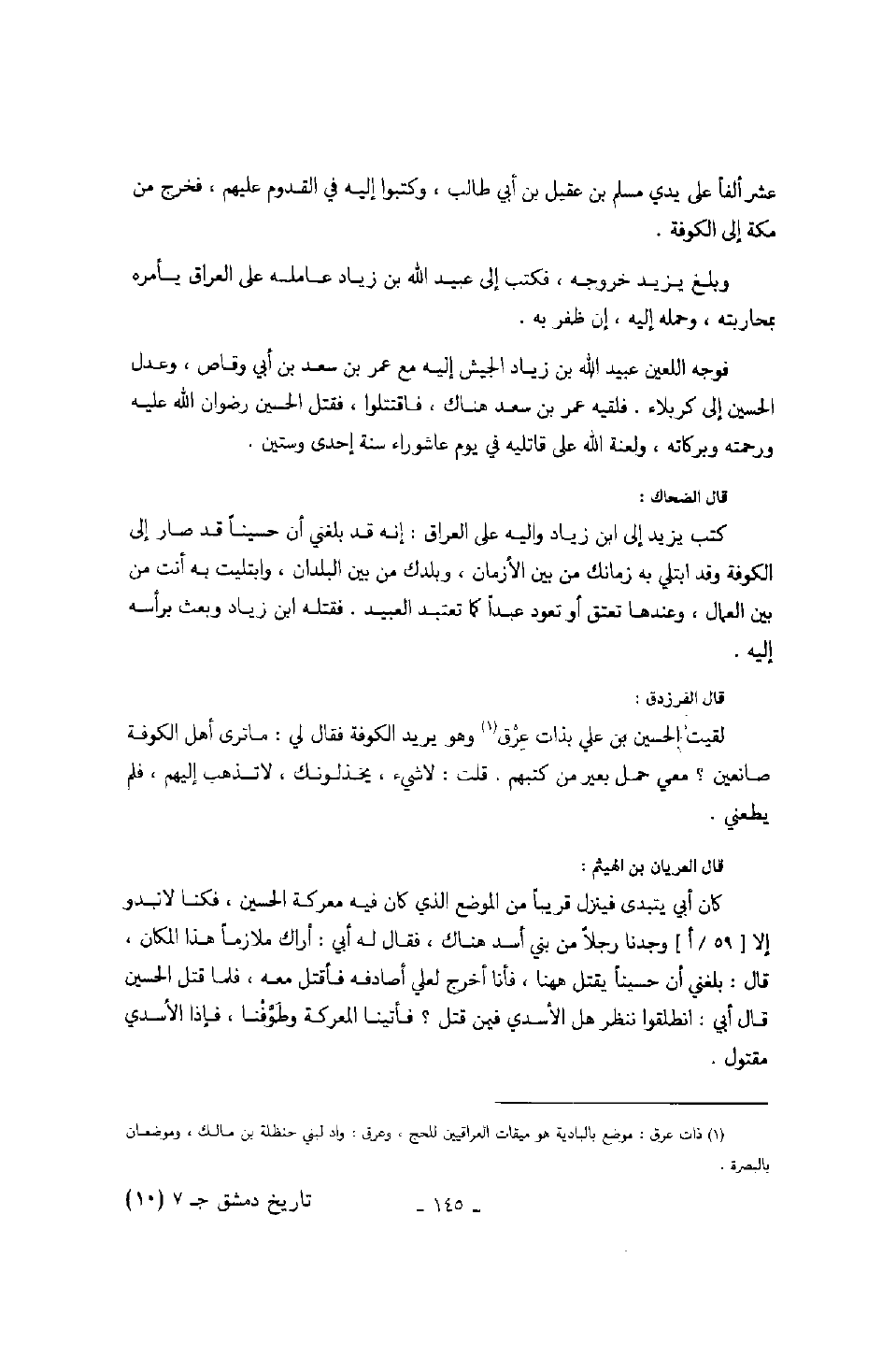 قال الفرزدق: لقيت الحسين بن علي بذات عرق وهو يريد الكوفة فقال لي: ما ترى أهل الكوفة صانعين؟ معي حمل بعير من كتبهم. قلت: لا شيء، يخذلونك، لا تذهب إليهم، فلم يطعني.