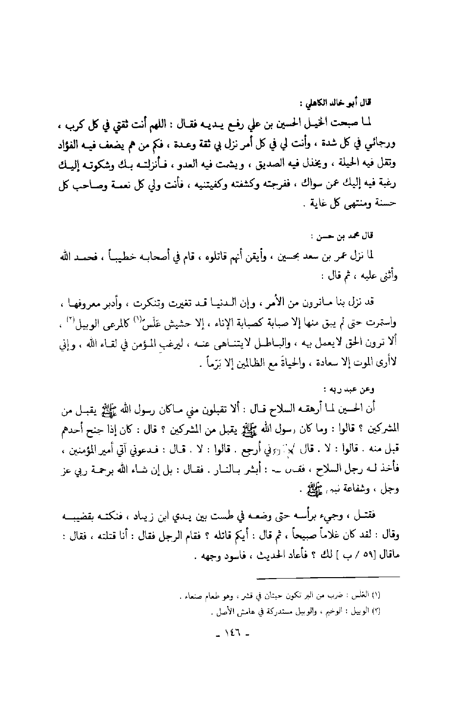 لما صبحت الخيل الحسين بن علي رفع يديه فقال: اللهم أنت ثقتي في كل كرب، ورجائي في كل شدة، وأنت لي في كل أمر نزل بي ثقة وعدة، فكم من هم يضعف فيه الفؤاد وتقل فيه الحيلة، ويخذل فيه الصديق، ويشمت فيه العدو، فأنزلته بك وشكوته إليك رغبة فيه إليك عمن سواك، ففرجته وكشفته وكفيتنيه، فأنت ولي كل نعمة وصاحب كل حسنة ومنتهى كل غاية.