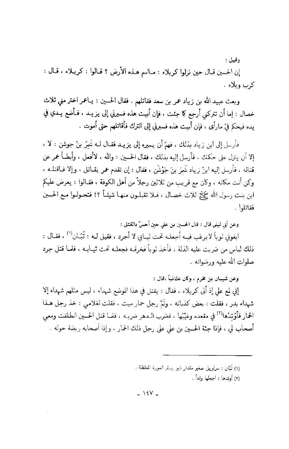فأرسل إلى ابن زياد بذلك، فهم أن يسيره إلى يزيد فقال له شمر بن جوشن: لا، إلا أن ينزل على حكمك، فأرسل إليه بذلك، فقال الحسين: والله، لا أفعل، وأبطأ عمر عن قتاله، فأرسل إليه ابن زياد شمر بن جوشن، فقال: إن تقدم عمر يقاتل، وإلا فاقتله، وكن أنت مكانه، وكان مع قريب من ثلاثين رجلاً من أهل الكوفة، فقالوا: يعرض عليكم ابن بنت رسول الله صَلَّى اللهُ عَلَيْهِ وَسَلَّمَ ثلاث خصال، فلا تقبلون منها شيئاً؟! فتحولوا مع الحسين فقاتلوا.