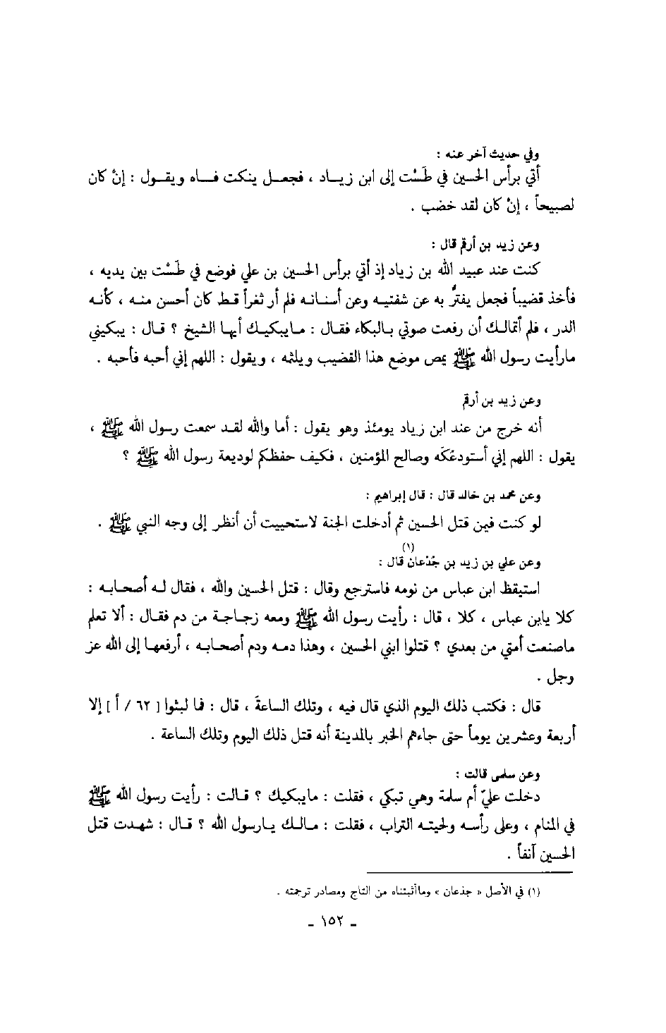 وفي حديث آخر عنه: أتي برأس الحسين في طست إلى ابن زياد، فجعل ينكت فاه ويقول: إن كان لصبيحاً، إن كان لقد خضب.