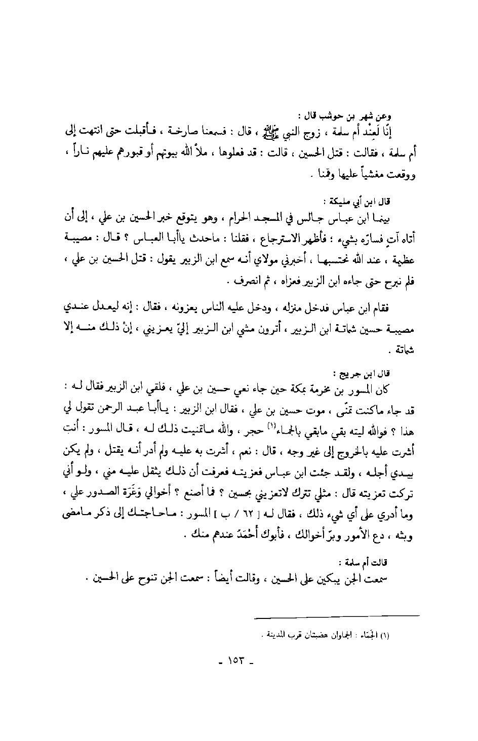وعن شهر بن حوشب قال: إنا لعند أم سلمة، زوج النبي صَلَّى اللهُ عَلَيْهِ وَسَلَّمَ، قال: فسمعنا صارخة، فأقبلت حتى انتهت إلى أم سلمة، فقالت: قتل الحسين، قالت: قد فعلوها، ملأ الله بيوتهم أو قبورهم عليهم ناراً، ووقعت مغشياً عليها وقمنا.