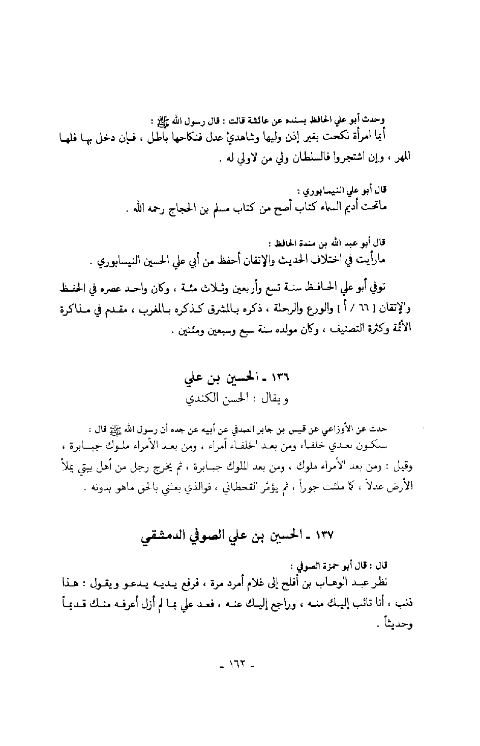 وحدث أبو علي الحافظ بسنده عن عائشة قالت: قال رسول الله صَلَّى اللهُ عَلَيْهِ وَسَلَّمَ: أيما امرأة نكحت بغير إذن وليها وشاهدي عدل فنكاحها باطل، فإن دخل بها فلها المهر، وإن اشتجروا فالسلطان ولي من لا ولي له.