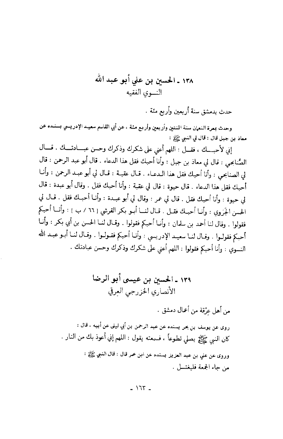 وحدث بمعرة النعمان سنة اثنتين وأربعين وأربع مئة، عن أبي القاسم سعيد الإدريسي بسنده عن معاذ بن جبل قال: قال لي النبي صَلَّى اللهُ عَلَيْهِ وَسَلَّمَ: إني لأحبك، فقل: اللهم أعني على شكرك وذكرك وحسن عبادتك. قال الصنابحي: قال لي معاذ بن جبل: وأنا أحبك فقل هذا الدعاء. قال أبو عبد الرحمن: قال لي الصنابحي: وأنا أحبك فقل هذا الدعاء. قال عقبة: قال لي أبو عبد الرحمن: وأنا أحبك فقل هذا الدعاء. قال حيوة: قال لي عقبة: وأنا أحبك فقل. وقال أبو عبدة: قال لي حيوة: وأنا أحبك فقل. قال لي عمر: وقال لي أبو عبدة: وأنا أحبك فقل. قال لي الحسن الجروي: وأنا أحبك فقل. قال لنا أبو بكر القرشي: وأنا أحبكم فقولوا. وقال لنا أحمد بن سلمان: وأنا أحبكم فقولوا. وقال لنا الحسن بن أبي بكر: وأنا أحبكم فقولوا. وقال لنا سعيد الإدريسي: وأنا أحبكم فقولوا. وقال لنا أبو عبد الله النسوي: وأنا أحبكم فقولوا: اللهم أعني على شكرك وذكرك وحسن عبادتك.