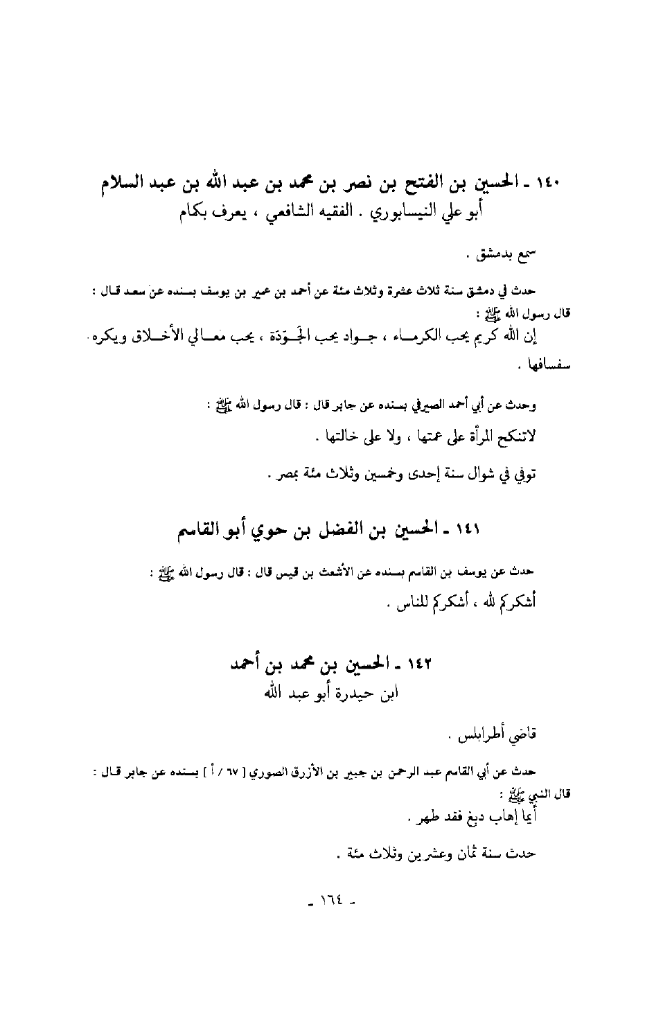 حدث في دمشق سنة ثلاث عشرة وثلاثة مئة عن أحمد بن عمير بن يوسف بسنده عن سعد قال: قال رسول الله صَلَّى اللهُ عَلَيْهِ وَسَلَّمَ: إن الله كريم يحب الكرماء، جواد يحب الجودة، يحب معالي الأخلاق ويكره سفسافها.