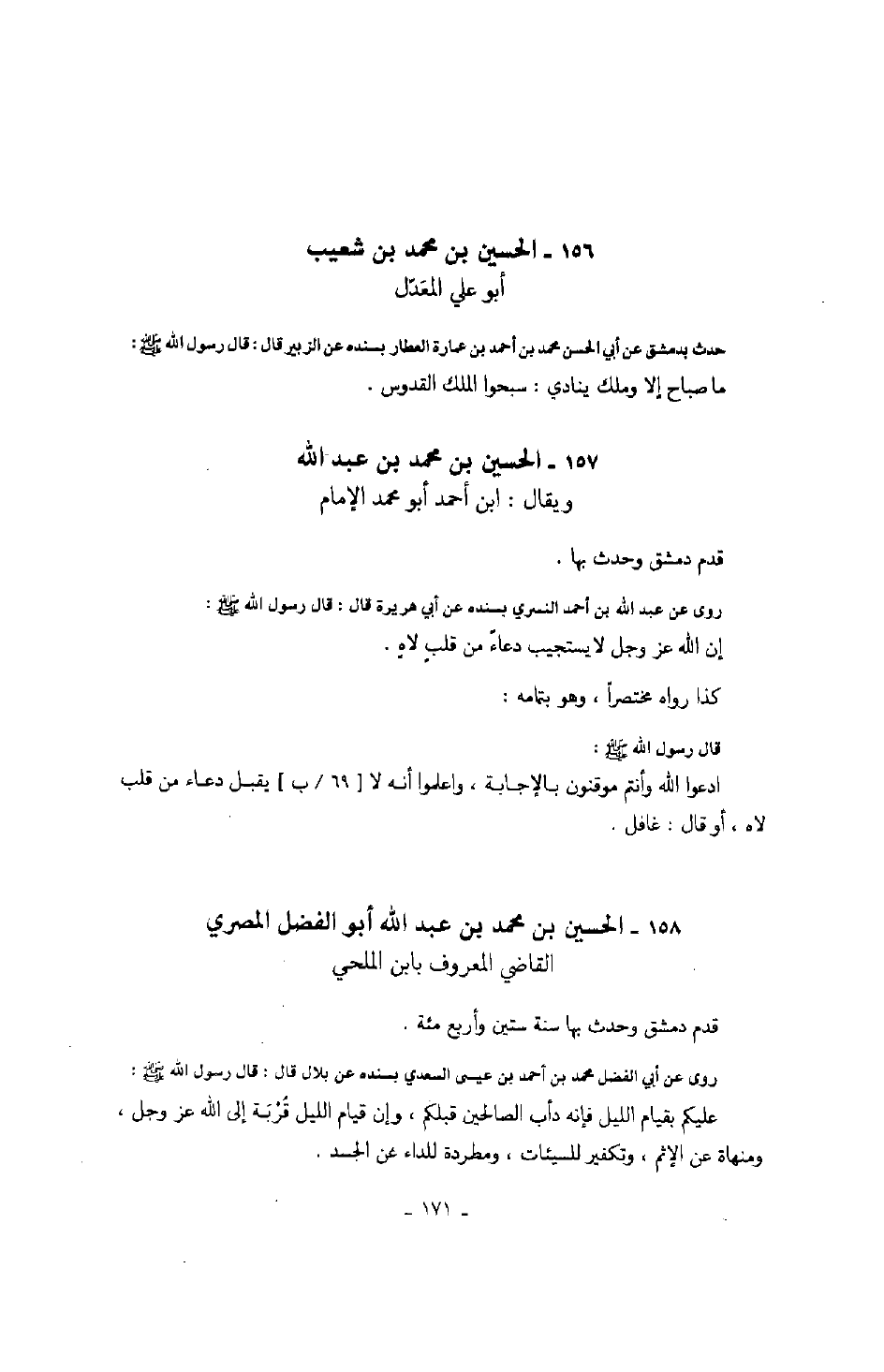 روى عن أبي الفضل محمد بن أحمد بن عيسى السعدي بسنده عن بلال قال: قال رسول الله صَلَّى اللهُ عَلَيْهِ وَسَلَّمَ: عليكم بقيام الليل فإنه دأب الصالحين قبلكم، وإن قيام الليل قربة إلى الله عز وجل، ومنهاة عن الإثم، وتكفير للسيئات، ومطردة للداء عن الجسد.