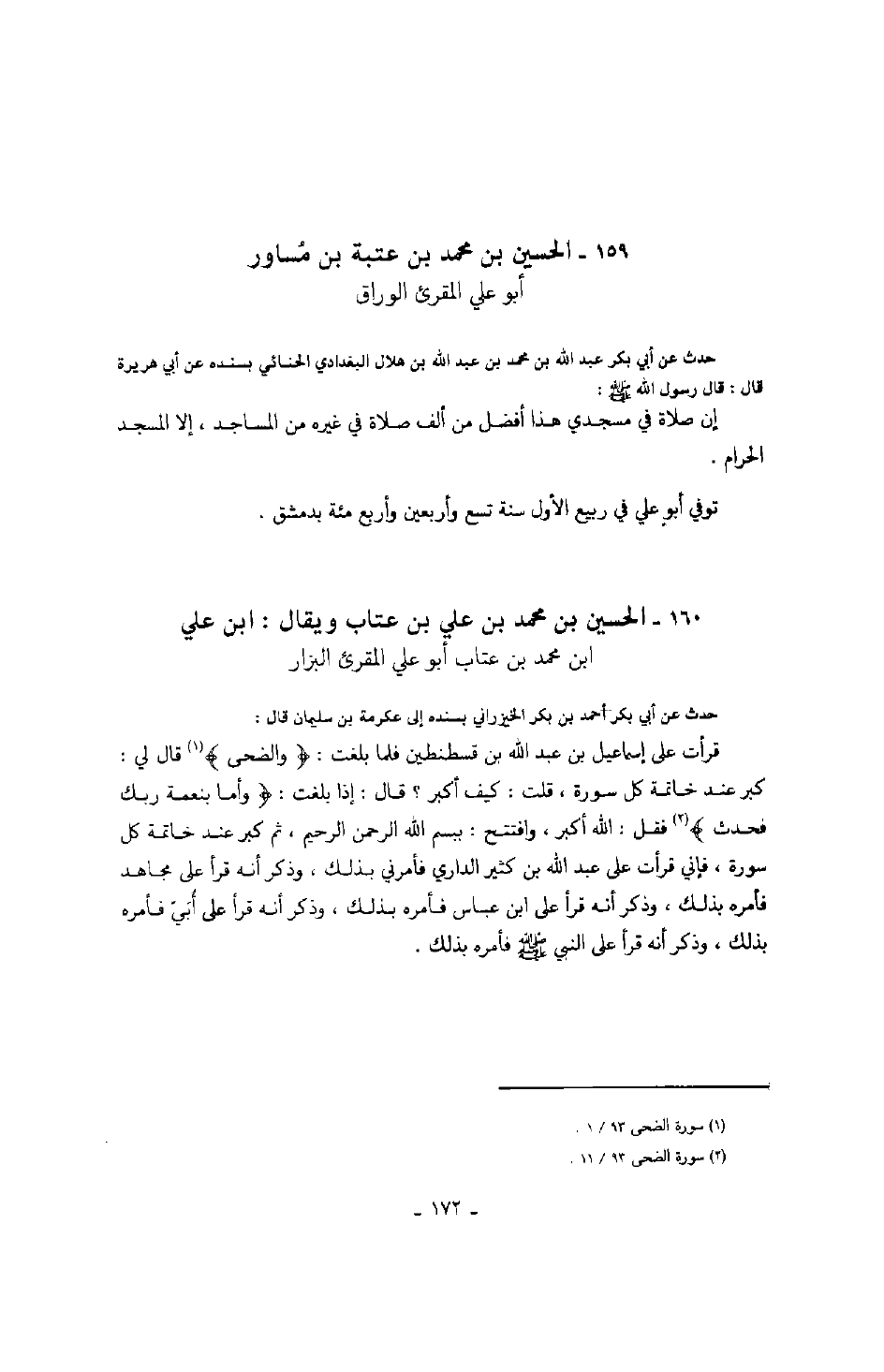 أبو علي المقرئ الوراق حدث عن أبي بكر عبد الله بن محمد بن عبد الله بن هلال البغدادي الحنائي بسنده عن أبي هريرة قال: قال رسول الله صَلَّى اللهُ عَلَيْهِ وَسَلَّمَ: إن صلاة في مسجدي هذا أفضل من ألف صلاة في غيره من المساجد، إلا المسجد الحرام.