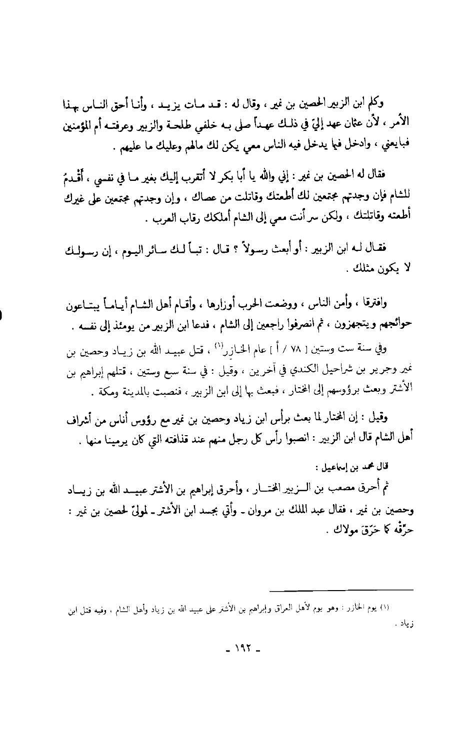 وفي سنة ست وستين عام الخازر، قتل عبيد الله بن زياد وحصين بن نمير وجرير بن شراحيل الكندي في آخرين، وقيل: في سنة سبع وستين، قتلهم إبراهيم بن الأشتر وبعث برؤوسهم إلى المختار، فبعث بها إلى ابن الزبير، فنصبت بالمدينة ومكة.