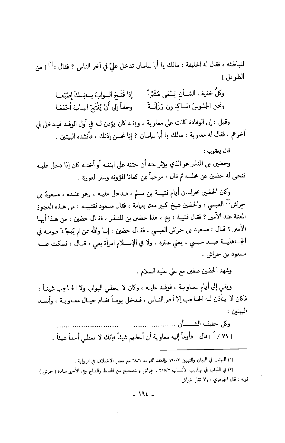 وقيل: إن الوفادة كانت على معاوية، وإنه كان يؤذن له في أول الوفد فيدخل في آخرهم، فقال له معاوية: مالك يا أبا ساسان؟ إنا نحسن إذنك، فأنشده البيتين.