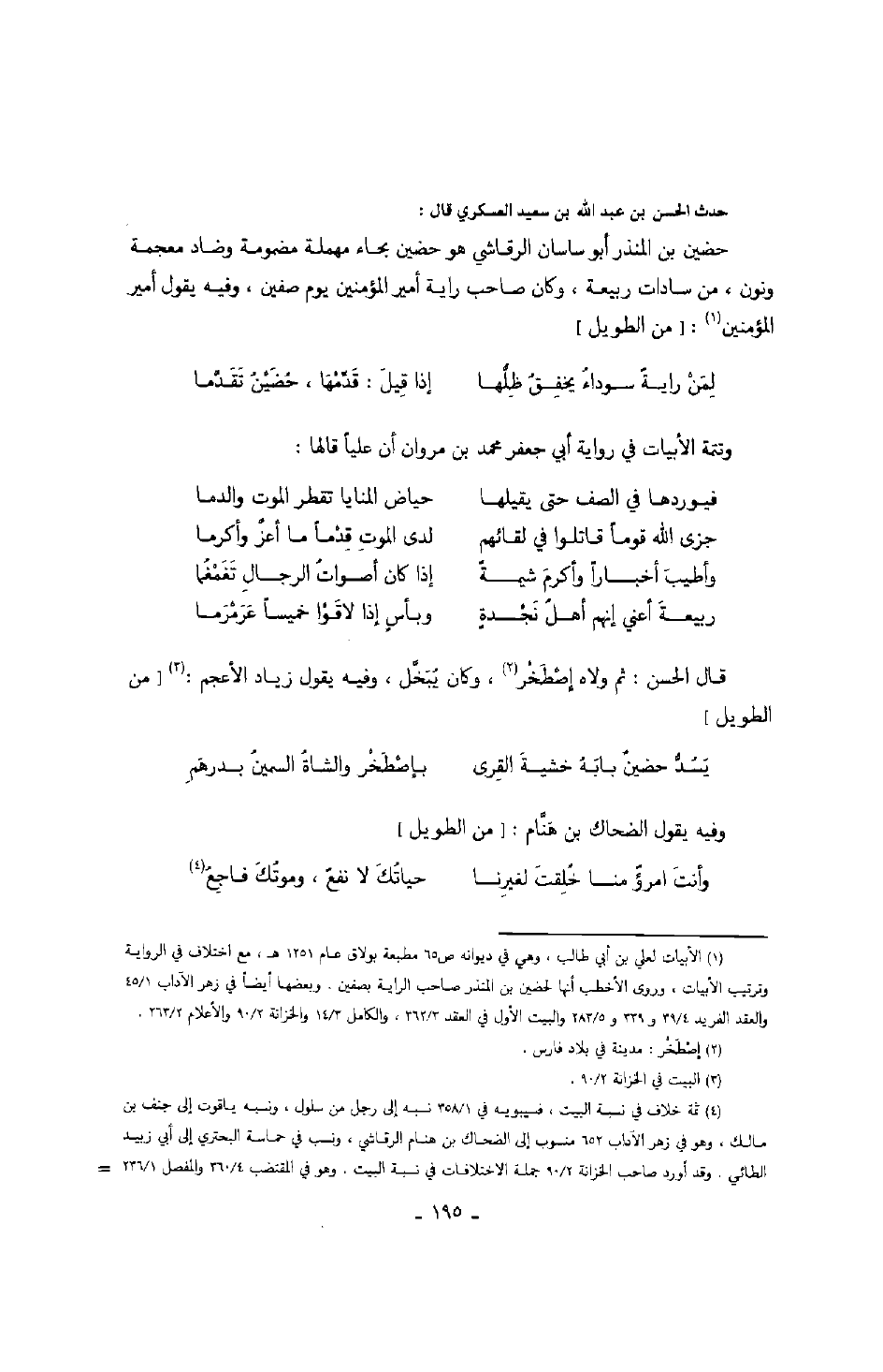 حدث الحسن بن عبد الله بن سعيد العسكري قال: حضين بن المنذر أبو ساسان الرقاشي هو حضين بحاء مهملة مضمومة وضاد معجمة ونون، من سادات ربيعة، وكان صاحب راية أمير المؤمنين يوم صفين، وفيه يقول أمير المؤمنين: من الطويل