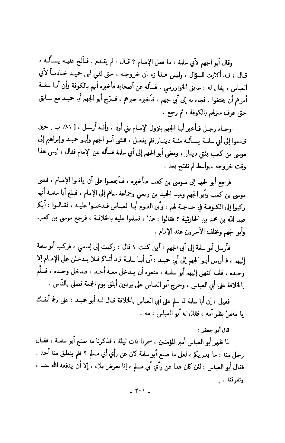 وقال أبو الجهم لأبي سلمة: ما فعل الإمام؟ قال: لم يقدم. فألح عليه يسأله، قال: قد أكثرت السؤال، وليس هذا زمان خروجه، حتى لقي ابن حميد خادماً لأبي العباس، يقال له: سابق الخوارزمي. فسأله عن أصحابه فأخبره أنهم بالكوفة وأن أبا سلمة أمرهم أن يختفوا. فجاء به إلى أبي جهم، فأخبره خبرهم، فسرح أبو الجهم أبا حميد مع سابق حتى عرف منزلهم بالكوفة، ثم رجع.