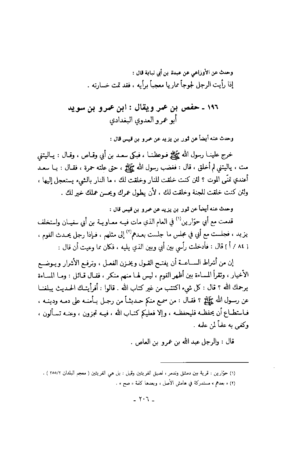 ابن سويد أبو عمرو العدوي البغدادي وحدث عنه أيضاً عن ثور بن يزيد عن عمرو بن قيس قال: خرج علينا رسول الله صَلَّى اللهُ عَلَيْهِ وَسَلَّمَ فوعظنا، فبكى سعد بن أبي وقاص، وقال: يا ليتني مت، يا ليتني لم أخلق، قال: فغضب رسول الله صَلَّى اللهُ عَلَيْهِ وَسَلَّمَ، حتى علته حمرة، فقال: يا سعد أعندي تمنى الموت؟ لئن كنت خلقت للنار وخلقت لك، ما النار بالشيء يستعجل إليها، ولئن كنت خلقت للجنة وخلقت لك، لأن يطول عمرك ويحسن عملك خير لك.