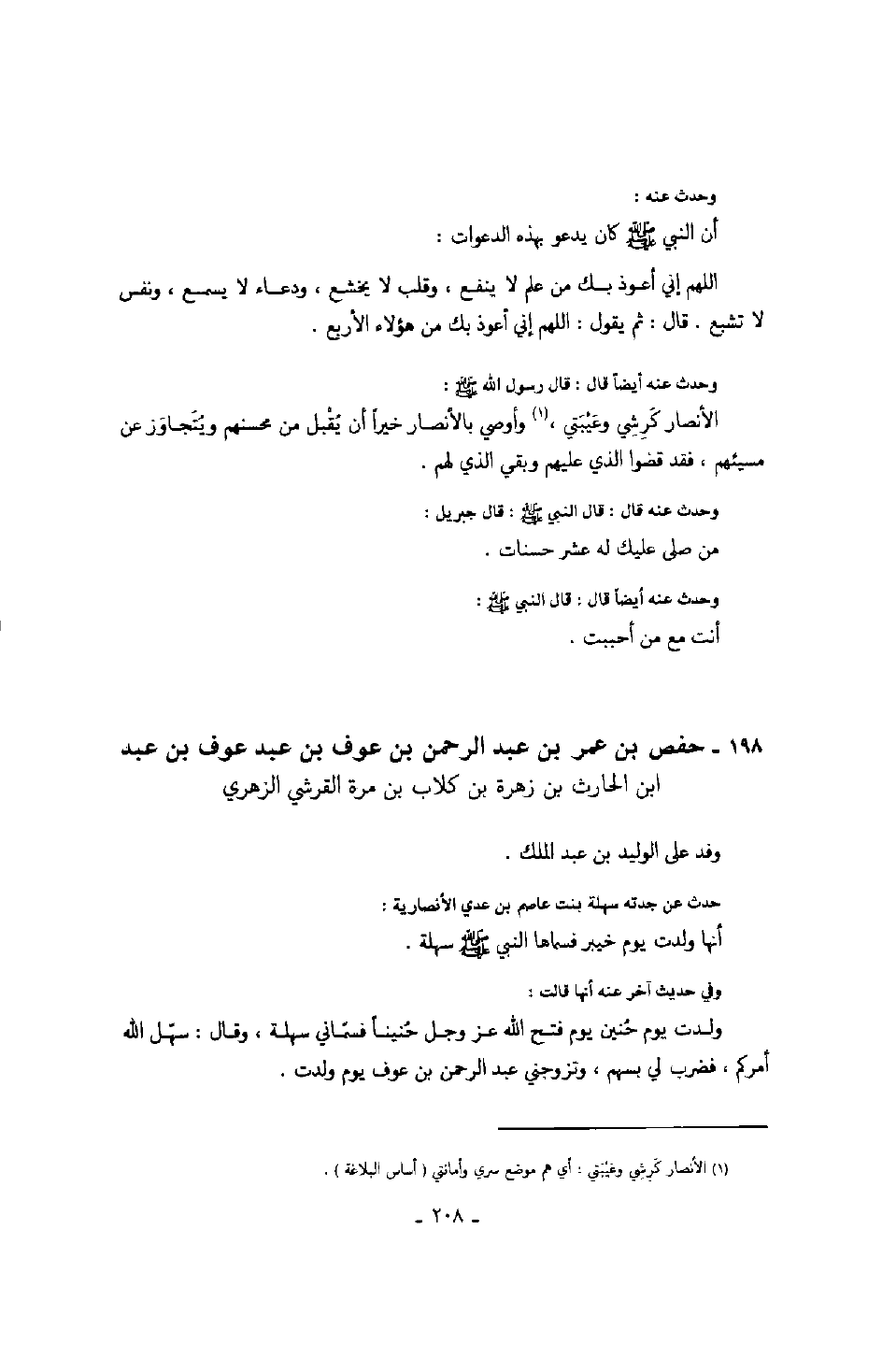 وحدث عنه أيضاً قال: قال رسول الله صَلَّى اللهُ عَلَيْهِ وَسَلَّمَ: النصار كرشي وعيبتي، وأوصي بالأنصار خيراً أن يقبل من محسنهم ويتجاوز عن مسيئهم، فقد قضوا الذي عليهم وبقي الذي لهم.