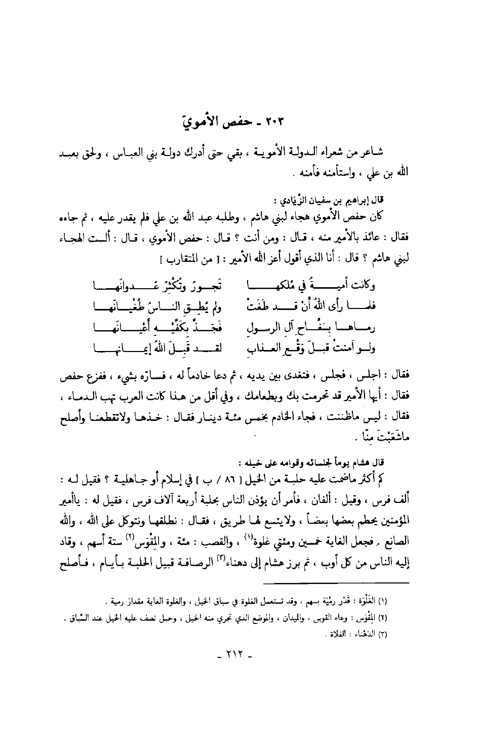 قال إبراهيم بن سفيان الزيادي: كان حفص الأموي هجاء لبني هاشم، وطلبه عبد الله بن علي فلم يقدر عليه، ثم جاءه فقال: عائذ بالأمير منه، قال: ومن أنت؟ قال: حفص الأموي، قال: ألست الهجاء لبني هاشم؟ قال: أنا الذي أقول أعز الله الأمير: من المتقارب