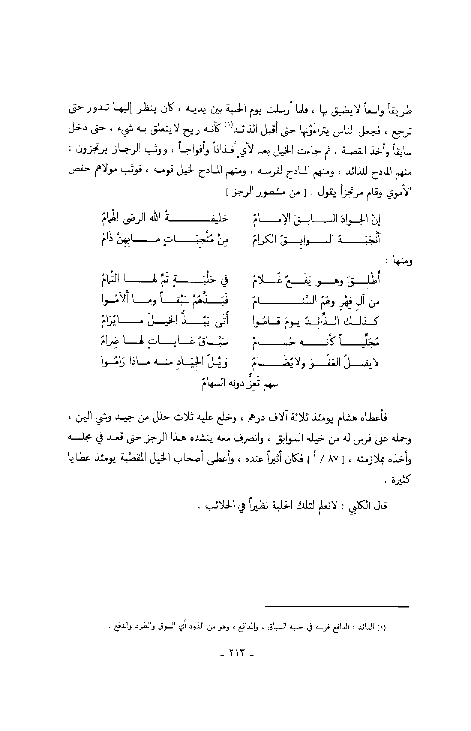 طريقاً واسعاً لا يضيق بها، فلما أرسلت يوم الحلبة بين يديه، كان ينظر إليها تدور حتى ترجع، فجعل الناس يتراءونها حتى أقبل الذائد كأنه ريح لا يتعلق به شيء، حتى دخل سابقاً وأخذ القصبة، ثم جاءت الخيل بعد لأيٍ أفذاذاً وأفواجاً، ووثب الرجاز يرتجزون: منهم المادح للذائد، ومنهم المادح لفرسه، ومنهم المادح لخيل قومه، فوثب مولاهم حفص الأموي وقام مرتجزاً يقول: من مشطور الرجز