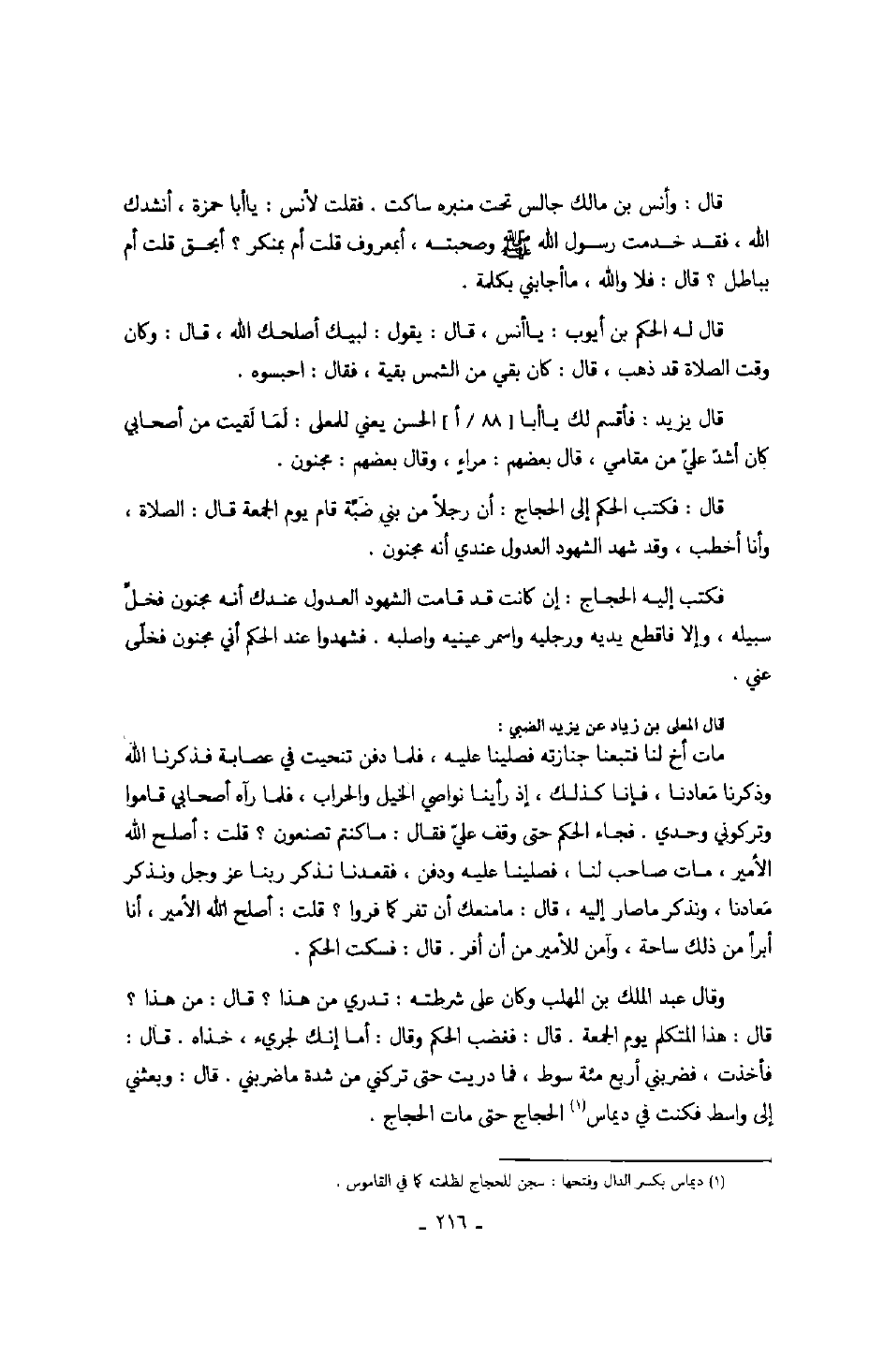 قال: فكتب الحكم إلى الحجاج: أن رجلاً من بني ضبة قام يوم الجمعة قال: الصلاة، وأنا أخطب، وقد شهد الشهود العدول عندي أنه مجنون.