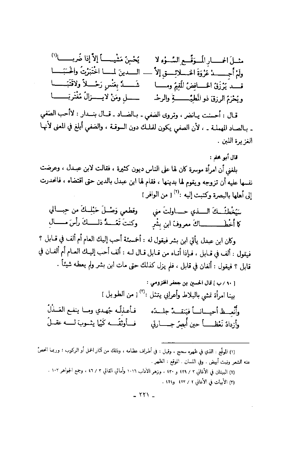 قال: أحسنت يا نضر، وتروى الضفي بالضاد قال بندار: لا أحب الصفي بالصاد المهملة، لأن الصفي يكون للملك دون السوقة، والضفي أبلغ في المعنى لأنها الغزيرة اللبن.