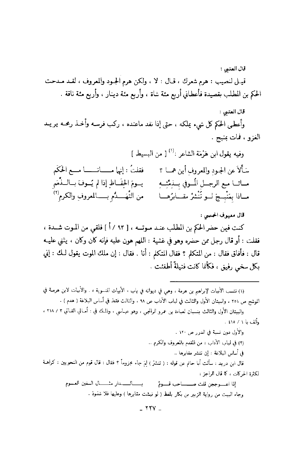 قال العتبي: قيل لنصيب: هرم شعرك، قال: لا، ولكن هرم الجود والمعروف، لقد مدحت الحكم بن المطلب بقصيدة فأعطاني أربع مئة شاة، وأربعمئة دينار، وأربع مئة ناقة.