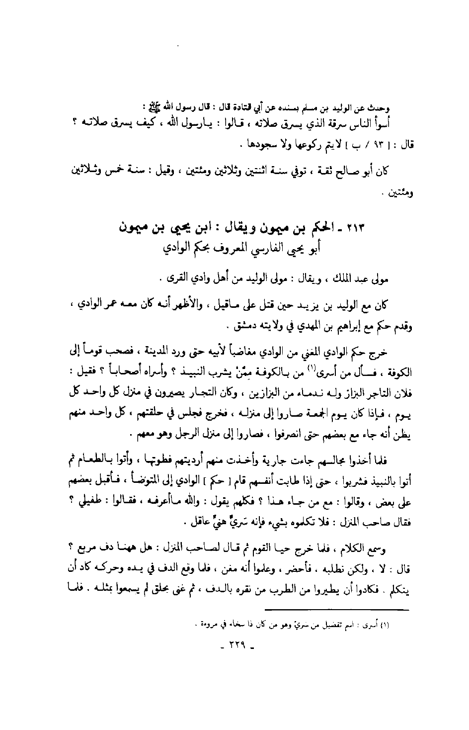 وحدث عن الوليد بن مسلم بسنده عن أبي قتادة قال: قال رسول الله صَلَّى اللهُ عَلَيْهِ وَسَلَّمَ: أسوأ الناس سرقة الذي يسرق صلاته، قالوا: يا رسول الله، كيف يسرق صلاته؟ قال: لا يتم ركوعها ولا سجودها.