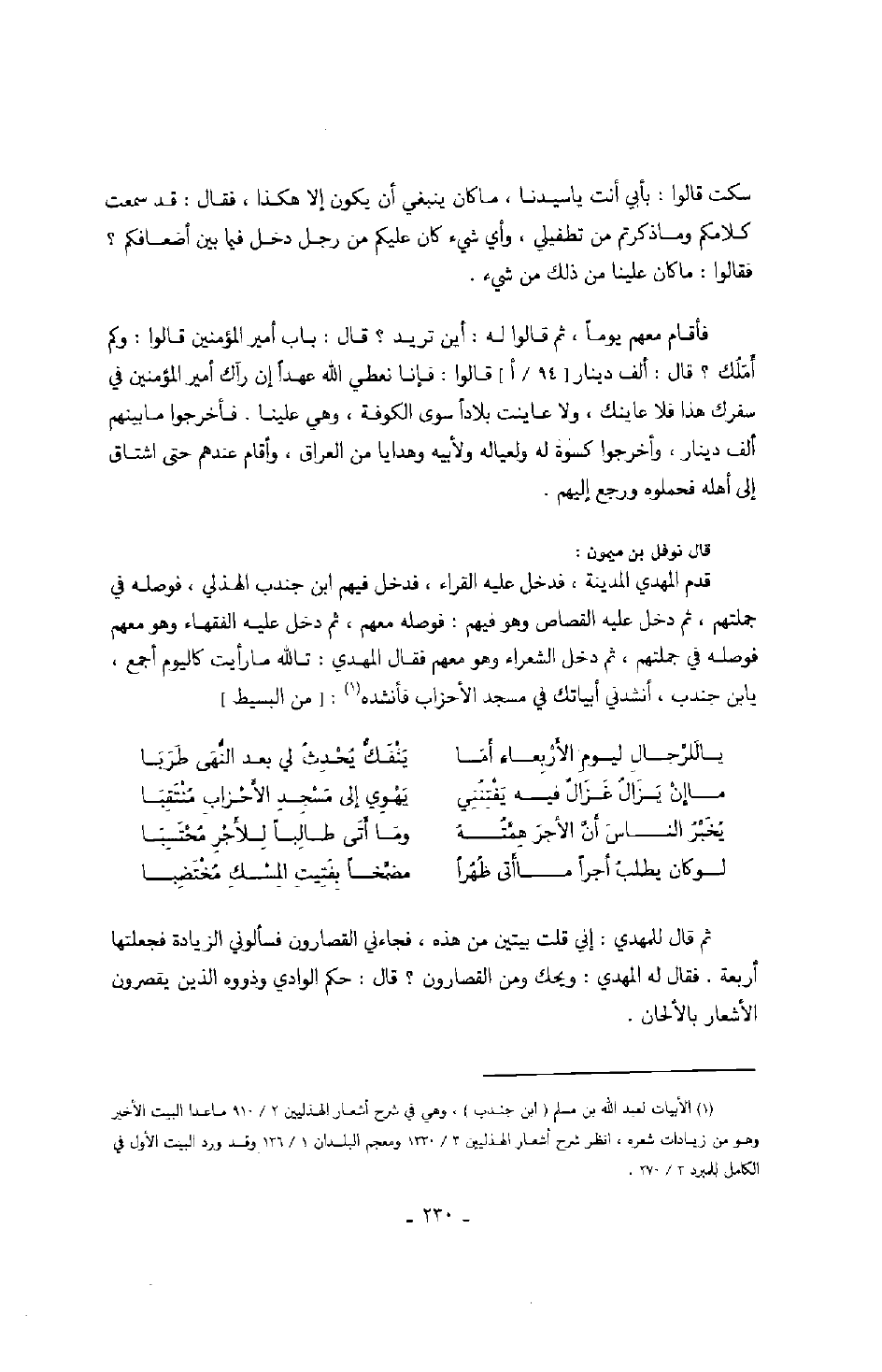 قال نوفل بن ميمون: قدم المهدي المدينة، فدخل عليه القراء، فدخل فيهم ابن جندب الهذلي، فوصله في جملتهم، ثم دخل عليه القصاص وهو فيهم: فوصله معهم، ثم دخل عليه الفقهاء وهو معهم فوصله في جملتهم، ثم دخل الشعراء وهو معهم فقال المهدي: تالله ما رأيت كاليوم أجمع، يا بن جندب، أنشدني أبياتك في مسجد الحزاب فأنشده: من البسيط