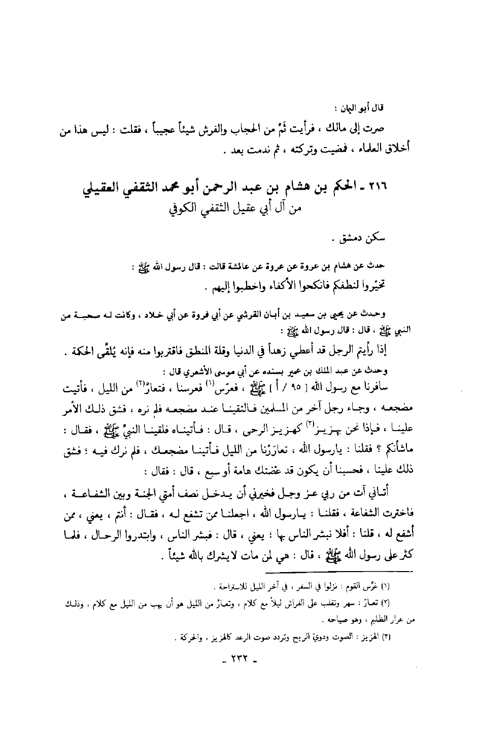 وحدث عن عبد الملك بن عمير بسنده عن أبي موسى الأشعري قال: سافرنا مع رسول الله صَلَّى اللهُ عَلَيْهِ وَسَلَّمَ، فعرس فعرسنا، فتعار من الليل، فأتيت مضجعه، وجاء رجل آخر من المسلمين فالتقينا عند مضجعه فلم نره، فشق ذلك الأمر علينا، فإذا نحن بهزيز كهزيز الرحى، قال: فأتيناه فلقينا النبي صَلَّى اللهُ عَلَيْهِ وَسَلَّمَ، فقال: ما شأنكم؟ فقال: يا رسول الله، تعاررنا من الليل فأتينا مضجعك، فلم نرك فيه؛ فشق ذلك علينا، فحسبنا أن يكون قد غضتك هامة أو سبع، قال: فقال: أتاني آت من ربي عز وجل فخيرني أن يدخل نصف أمتي الجنة وبين الشفاعة، فاخترت الشفاعة، فقلنا: يا رسول الله، اجعلنا ممن تشفع له، فقال: أنتم، يعني، ممن أشفع له، قلنا: أفلا نبشر الناس بها؛ يعني، قال: فبشر الناس، وابتدروا الرحال، فلما كثر على رسول الله صَلَّى اللهُ عَلَيْهِ وَسَلَّمَ، قال: هي لمن مات لا يشرك بالله شيئاً.