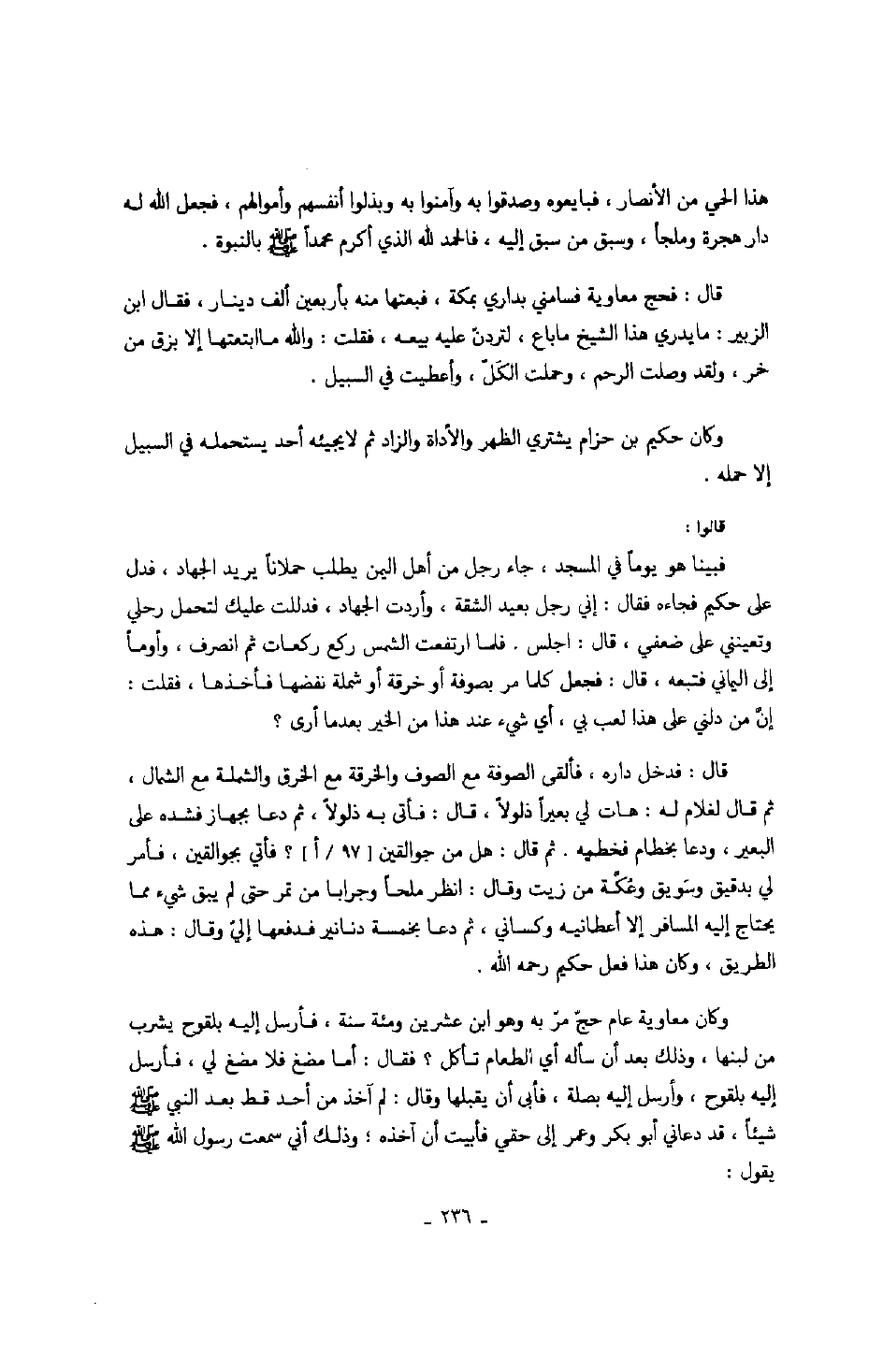 وكان حكيم بن حزام يشتري الظهر والأداة والزاد ثم لا يجيئه أحد يستحمله في السبيل إلا حمله.