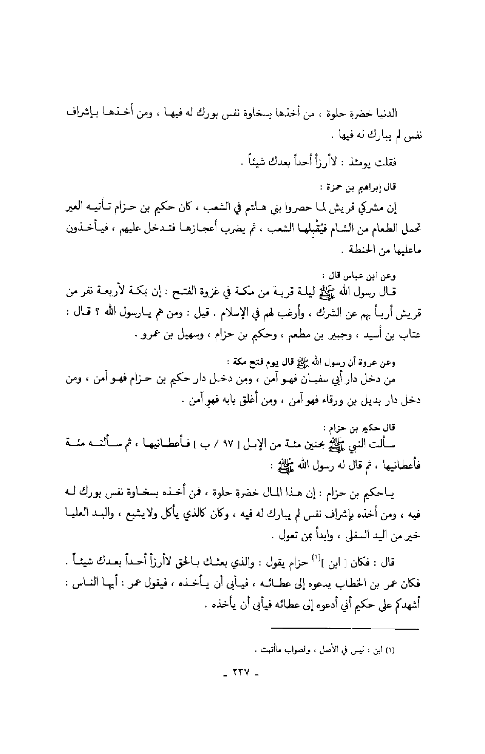 قال: فكان ابن حزام يقول: والذي بعثك بالحق لا أرزأ أحداً بعدك شيئاً. فكان عمر بن الخطاب يدعوه إلى عطائه، فيأبى أن يأخذه، فيقول عمر: أيها الناس: أشهدكم على حكيم أني أدعوه إلى عطائه فيأبى أن يأخذه.