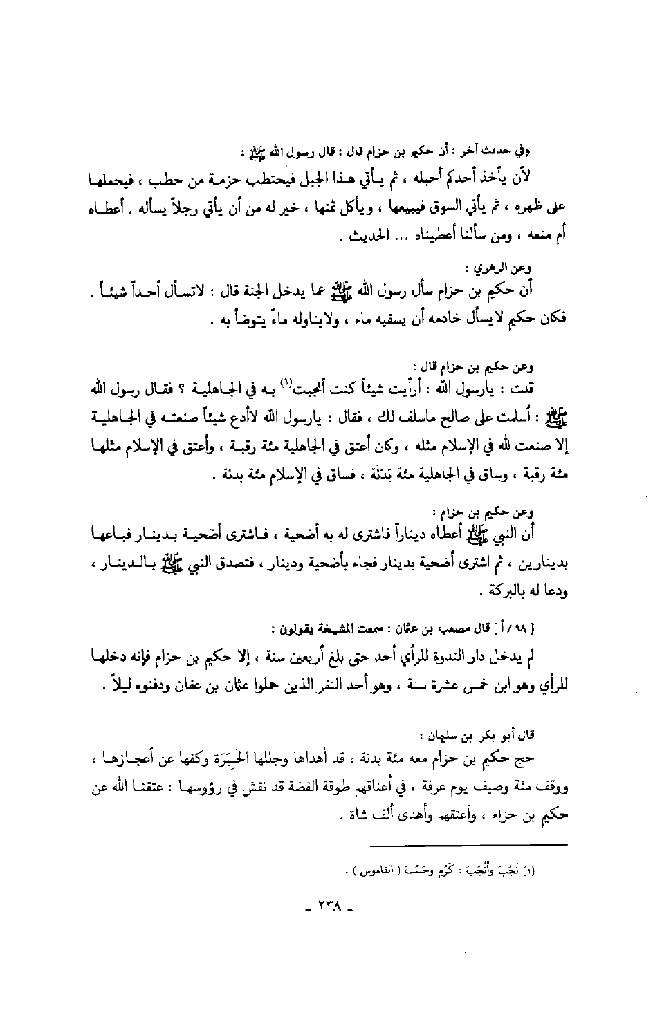 وعن حكيم بن حزام قال: قلت: يا رسول الله: أرأيت شيئاً كنت أنجبت به في الجاهلية؟ فقال رسول الله صَلَّى اللهُ عَلَيْهِ وَسَلَّمَ: أسلمت على صالح ما سلف لك، فقال: يا رسول الله لا أدع شيئاً صنعته في الجاهلية إلا صنعت لله في الإسلام مثله، وكان أعتق في الجاهلية مئة رقبة، وأعتق في الإسلام مثلها مئة رقبة، وساق في الجاهلية مئة بدنة، فساق في الإسلام مئة بدنة.