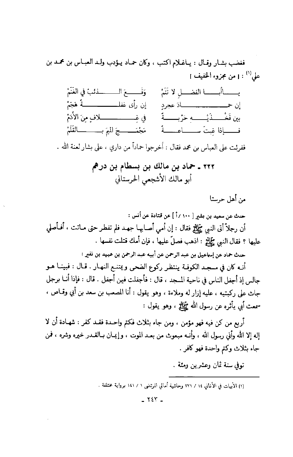 فغضب بشار وقال: يا غلام اكتب، وكان حماد يؤدب ولد العباس بن محمد بن علي: من مجزوء الخفيف
