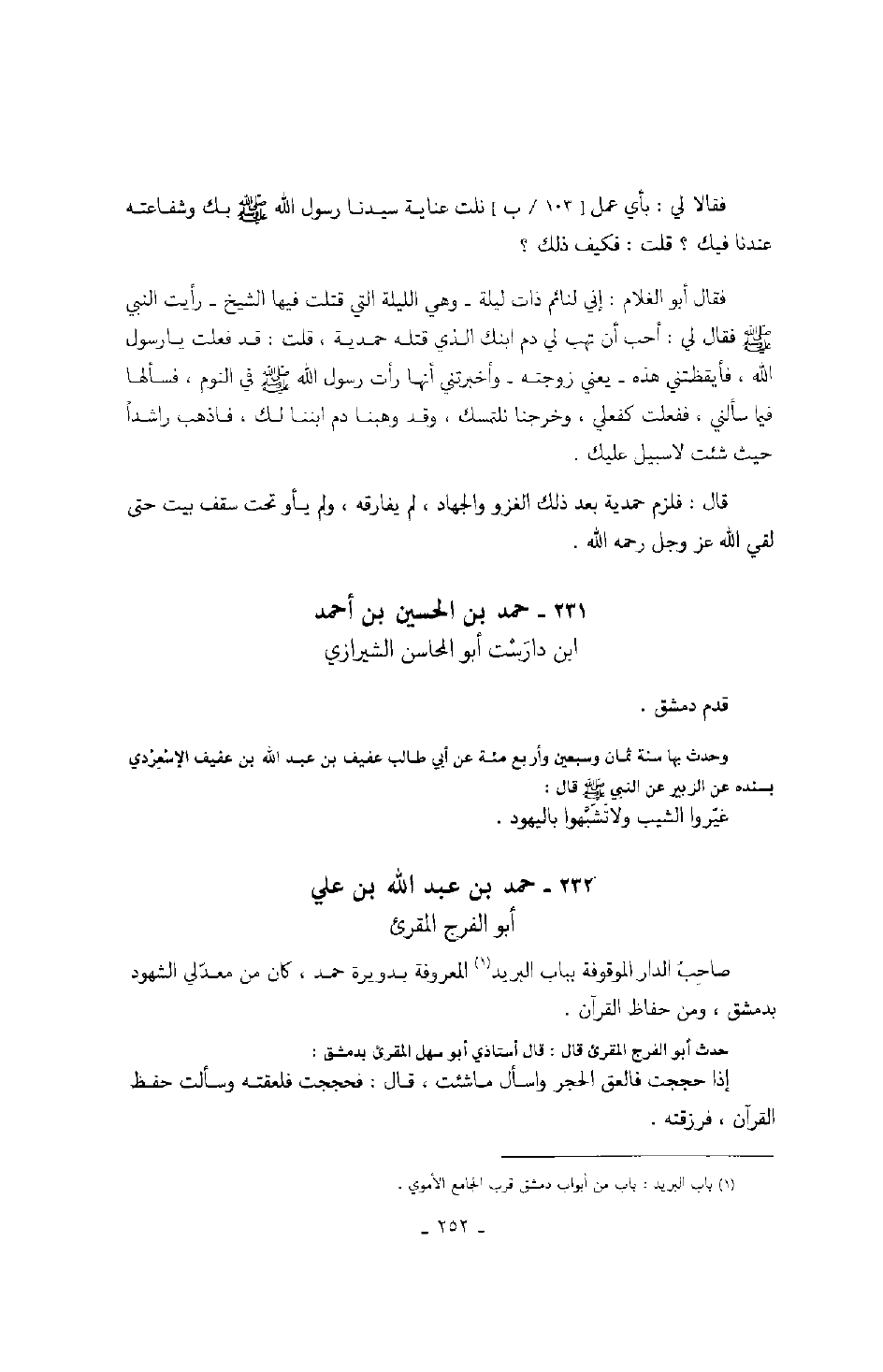 أبو الفرج المقرئ صاحب الدار الموقوفة بباب البريد المعروفة بدويرة حمد، كان من معدلي الشهود بدمشق، ومن حفاظ القرآن.
