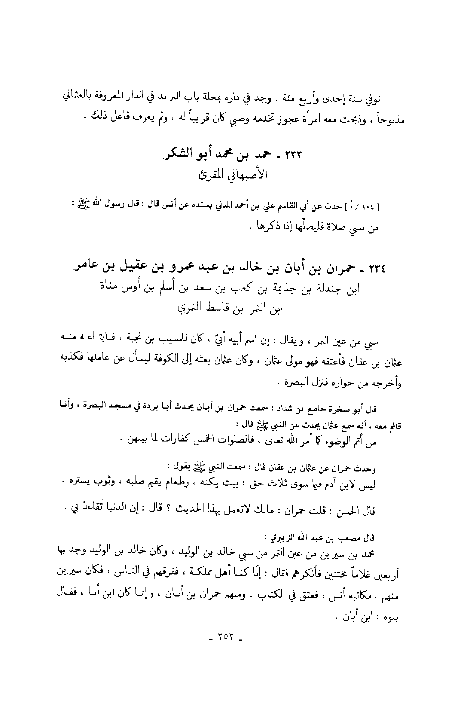 وحدث حمران عن عثمان بن عفان قال: سمعت النبي صَلَّى اللهُ عَلَيْهِ وَسَلَّمَ يقول: ليس لابن آدم فيما سوى ثلاث حق: بيت يكنه، وطعام يقيم صلبه، وثوب يستره.