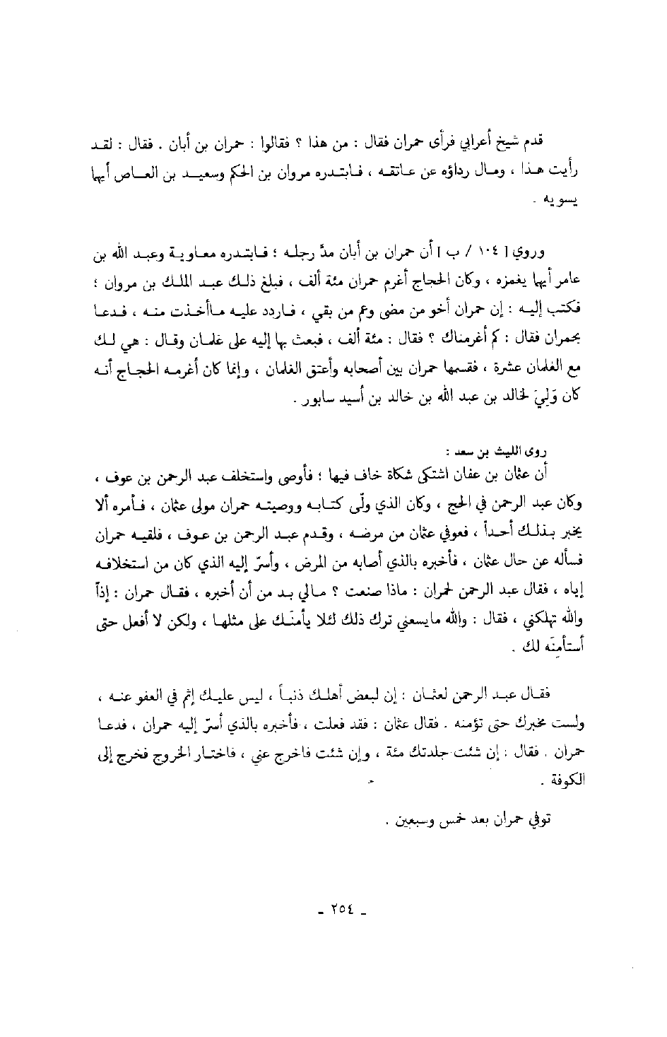 فقال عبد الرحمن لعثمان: إن لبعض أهلك ذنباً، ليس عليك إثم في العفو عنه، ولست مخبرك حتى تؤمنه. فقال عثمان: فقد فعلت، فأخبره بالذي أسر إليه حمران، فدعا حمران. فقال: إن شئت جلدتك مئة، وإن شئت فاخرج عني، فاختار الخروج فخرج إلى الكوفة.