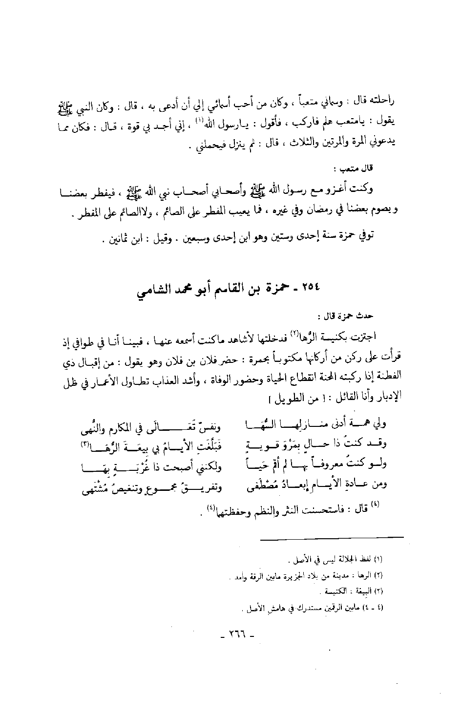 حدث حمزة قال: اجتزت بكنيسة الرها فدخلتها لأشاهد ما كنت أسمعه عنها، فبينا أنا في طوافي إذ قرأت على ركن من أركانها مكتوباً بحمرة: حضر فلان بن فلان وهو يقول: من إقبال ذي الفطنة إذا ركبته المحنة انقطاع الحياة وحضور الوفاة، وأشد العذاب تطاول الأعمار في ظل الإدبار وأنا القائل: من الطويل