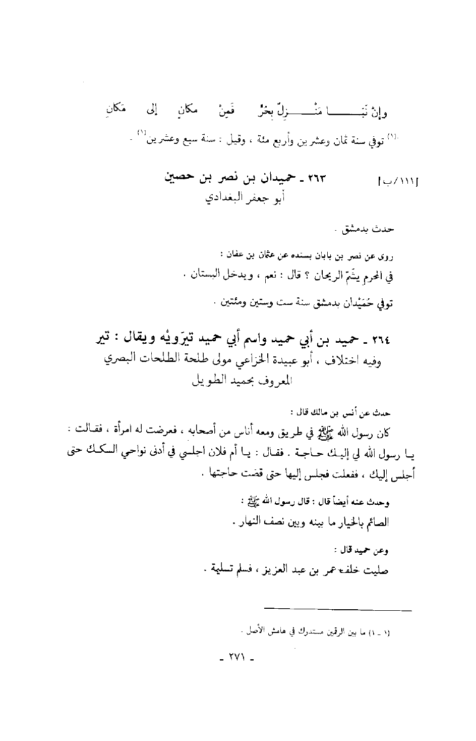 واسم أبي حميد تيرويه ويقال تير وفيه اختلاف أبو عبيدة الخزاعي مولى طلحة الطلحات البصري المعروف بحميد الطويل حدث عن أنس بن مالك قال: كان رسول الله صَلَّى اللهُ عَلَيْهِ وَسَلَّمَ في طريق ومعه أناس من أصحابه، فعرضت له امرأة، فقالت: يا رسول الله لي إليك حاجة. فقال: يا أم فلان اجلسي في أدنى نواحي السكك حتى أجلس إليك، ففعلت فجلس إليها حتى قضت حاجتها.