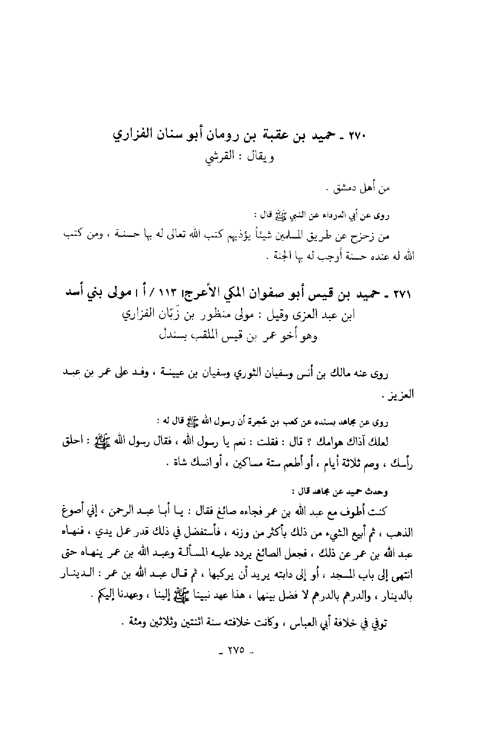 وحدث حميد عن مجاهد قال: كنت أطوف مع عبد الله بن عمر فجاءه صائغ فقال: يا أبا عبد الرحمن، إني أصوغ الذهب، ثم أبيع الشيء من ذلك بأكثر من وزنه، فأستفضل في ذلك قدر عمل يدي، فنهاه عبد الله بن عمر عن ذلك، فجعل الصائغ يردد عليه المسألة وعبد الله بن عمر ينهاه حتى انتهى إلى باب المسجد، أو إلى دابته يريد أن يركبها، ثم قال عبد الله بن عمر: الدينار بالدينار، والدرهم بالدرهم لا فضل بينهما، هذا عهد نبينا صَلَّى اللهُ عَلَيْهِ وَسَلَّمَ إلينا، وعهدنا إليكم.