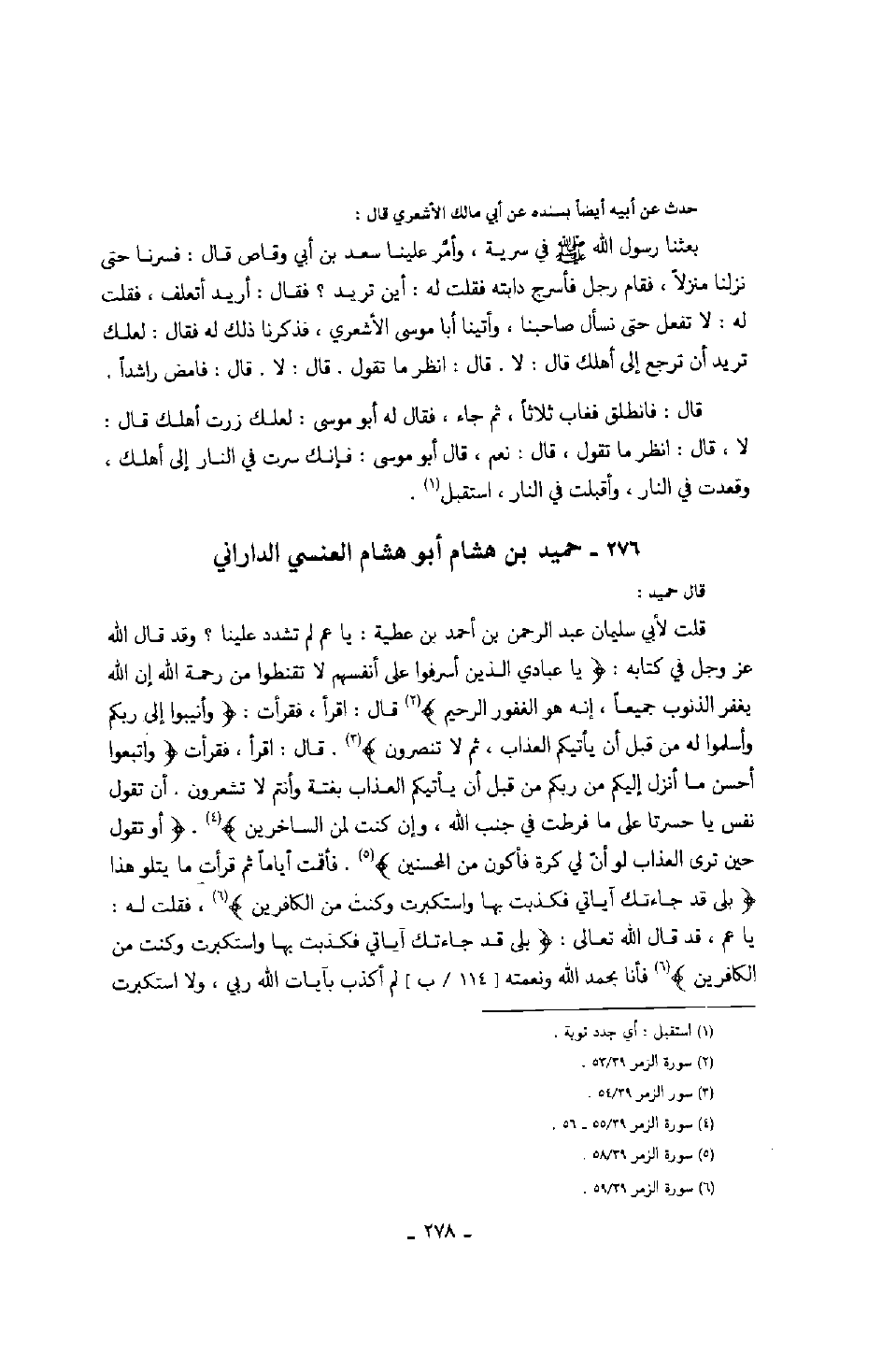 أبو هشام العنسي الداراني قال حميد: قلت لأبي سليمان عبد الرحمن بن أحمد بن عطية: يا عم لم تشدد علينا؟ وقد قال الله عز وجل في كتابه: " يا عبادي الذين أسرفوا على أنفسهم لا تقنطوا من رحمة الله إن الله يغفر الذنوب جميعاً، إنه هو الغفور الرحيم " قال: اقرأ، فقرأت: " وأنيبوا إلى ربكم وأسلموا له من قبل أن يأتيكم العذاب، ثم لا تنصرون ". قال: اقرأ، فقرأت " واتبعوا أحسن ما أنزل إليكم من ربكم من قبل أن يأتيكم العذاب بغتة وأنتم لا تشعرون. أن تقول نفس يا حسرتا على ما فرطت في جنب الله، وإن كنت لمن الساخرين ". " أو تقول حين ترى العذاب لو أن لي كرة فأكون من المحسنين ". فأقمت أياماً ثم قرأ ما يتلو هذا " بلى قد جاءتك آياتي فكذبت بها واستكبرت وكنت من الكافرين "، فقلت له: يا عم، قد قال الله تعالى: " بلى قد جاءتك آياتي فكذبت بها واستكبرت وكنت من الكافرين " فأنا بحمد الله ونعمته لم أكذب بآيات الله ربي، ولا استكبرت