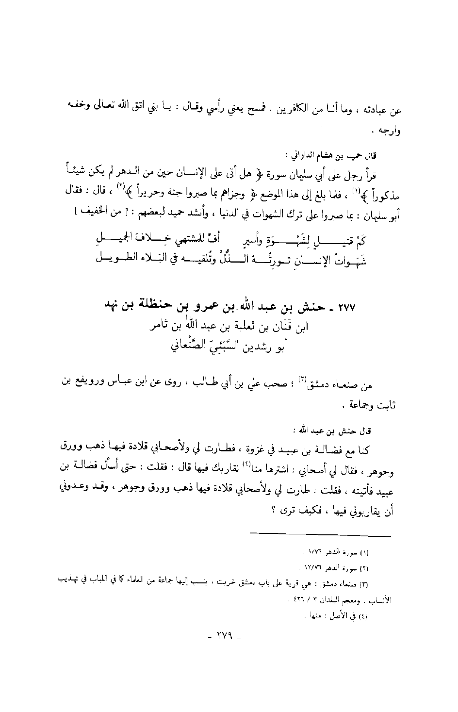 قال حميد بن هشام الداراني: قرأ رجل على أبي سليمان سورة " هل أتى على الإنسان حين من الدهر لم يكن شيئاً مذكوراً "، فلما بلغ إلى هذا الموضع " وجزاهم بما صبروا جنة وحريراً "، قال: فقال أبو سليمان: بما صبروا على ترك الشهوات في الدنيا، وأنشد حميد لبعضهم: من الخفيف