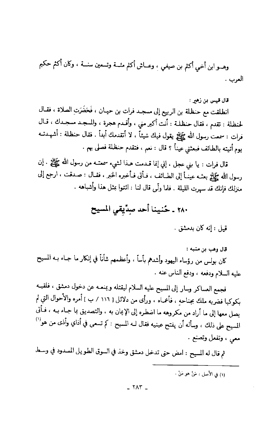 قال قيس بن زهير: انطلقت مع حنظلة بن الربيع إلى مسجد فرات بن حيان، فحضرت الصلاة، فقال لحنظلة: تقدم، فقال حنظلة: أنت أكبر مني، وأقدم هجرة، والمسجد مسجدك، قال فرات: سمعت رسول الله صَلَّى اللهُ عَلَيْهِ وَسَلَّمَ يقول فيك شيئاً، لا أتقدمك أبداً. فقال حنظلة: أشهدته يوم أتيته بالطائف فبعثني عيناً؟ قال: نعم، فتقدم حنظلة فصلى بهم.