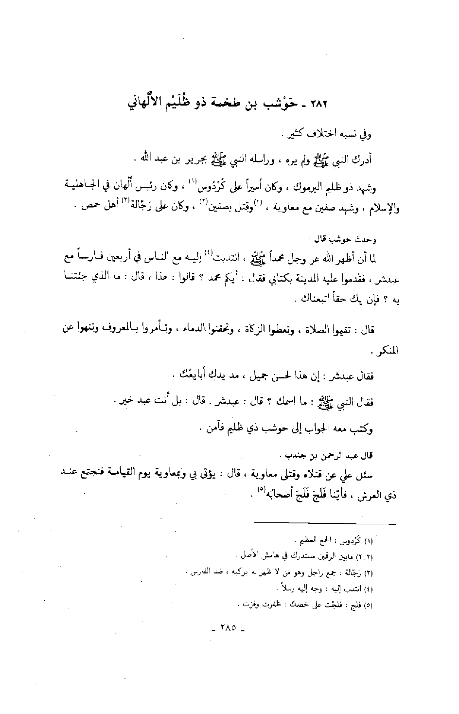 وحدث حوشب قال: لما أن أظهر الله عز وجل محمداً صَلَّى اللهُ عَلَيْهِ وَسَلَّمَ، انتدبت إليه مع الناس في أربعين فارساً مع عبدشر، فقدموا عليه المدينة بكتابي فقال: أيكم محمد؟ قالوا: هذا، قال: ما الذي جئتنا به؟ فإن يك حقاً اتبعناك.