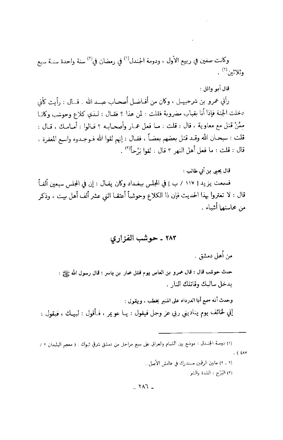 حدث حوشب قال: قال عمرو بن العاص يوم قتل عمار بن ياسر: قال رسول الله صَلَّى اللهُ عَلَيْهِ وَسَلَّمَ: يدخل سالبك وقاتلك النار.