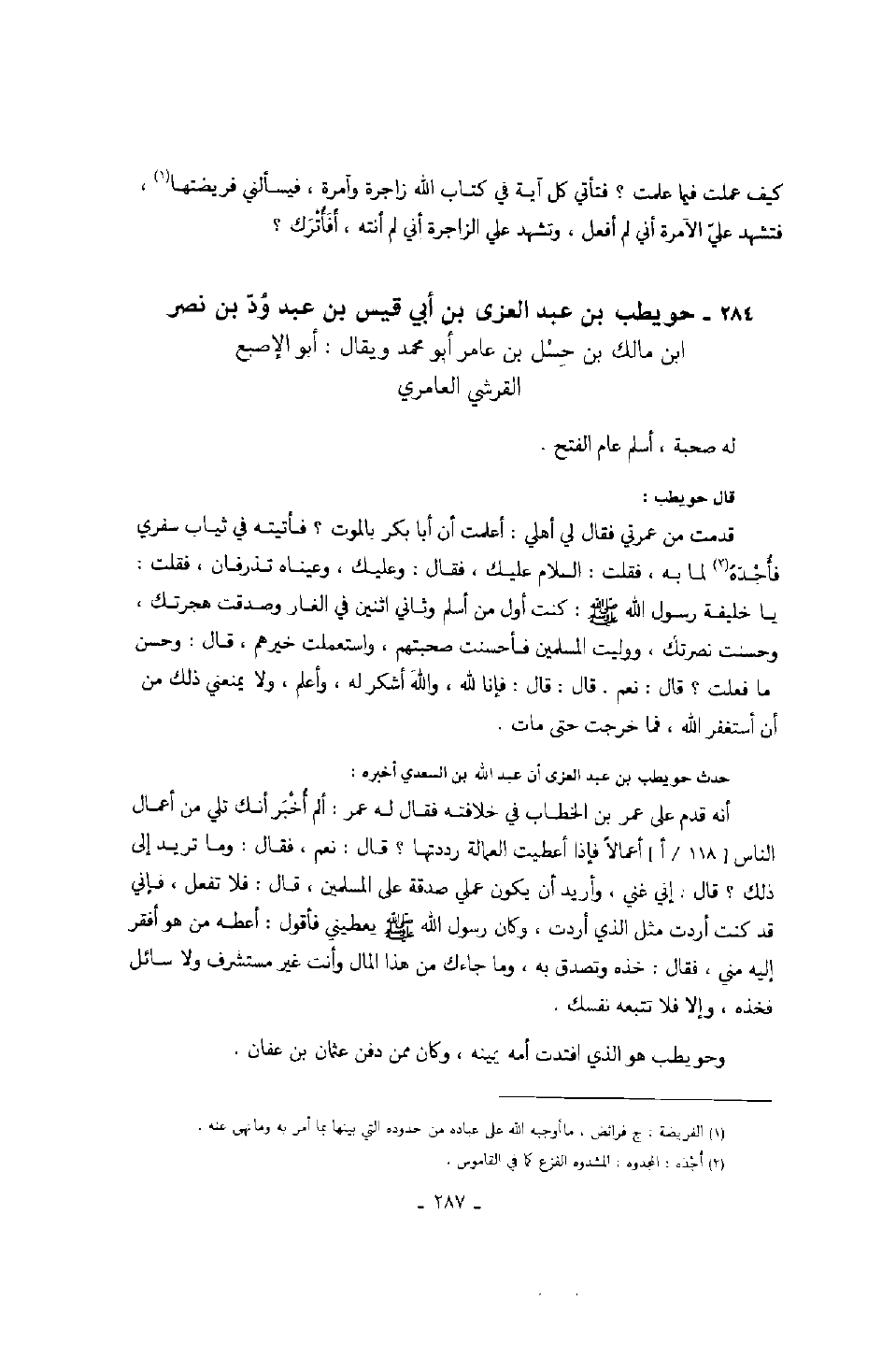 حدث حويطب بن عبد العزى أن عبد الله بن السعدي أخبره: أنه قدم على عمر بن الخطاب في خلافته فقال له عمر: ألم أخبر أنك تلي من أعمال الناس أعمالاً فإذا أعطيت العمالة رددتها؟ قال: نعم، فقال: وما تريد إلى ذلك؟ قال: إني غني، وأريد أن يكون عملي صدقة على المسلمين، قال: فلا تفعل، فإني قد كنت أردت مثل الذي أردت، وكان رسول الله صَلَّى اللهُ عَلَيْهِ وَسَلَّمَ يعطيني فأقول: أعطه من هو أفقر إليه مني، فقال: خذه وتصدق به، وما جاءك من هذا المال وأنت غير مستشرف ولا سائل فخذه، وإلا فلا تتبعه نفسك.