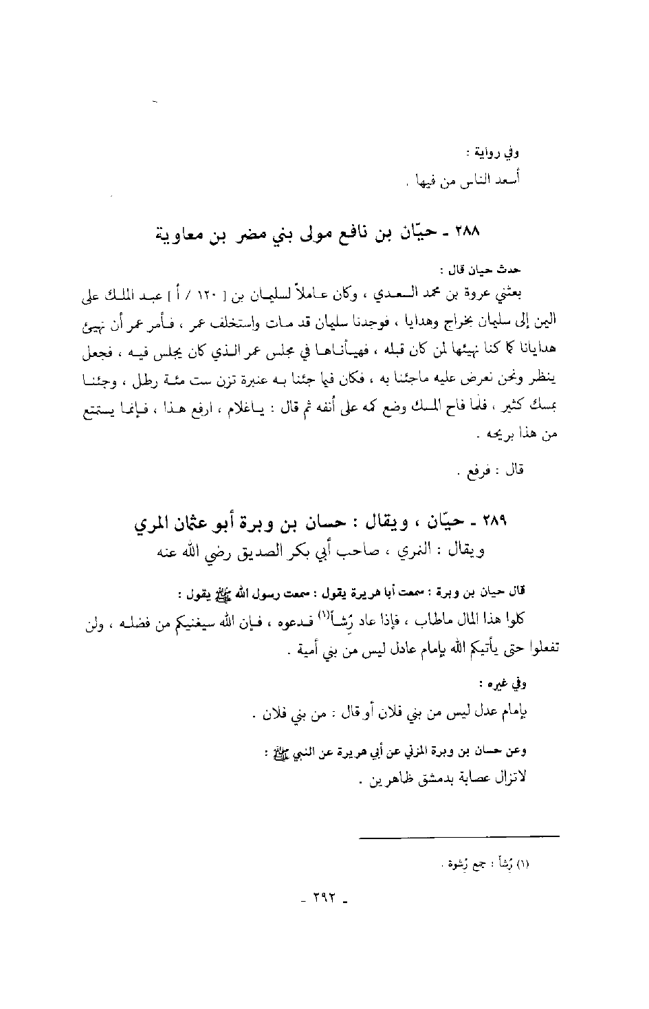 خرج أبو الدرداء يريد النبي صَلَّى اللهُ عَلَيْهِ وَسَلَّمَ فوجد جماعة من العرب يتفاخرون. قال: فأذن لي رسول الله صَلَّى اللهُ عَلَيْهِ وَسَلَّمَ فقال: يا أبا الدرداء ما هذا اللجب الذي أسمع؟ قال: قلت: يا رسول الله هذه العرب تتفاخر فيما بينها، فقال رسول الله صَلَّى اللهُ عَلَيْهِ وَسَلَّمَ: إذا فاخرت ففاخر بقريش، وإذا كاثرت فكاثر بتميم، وإذا حاربت فحارب بقيس، ألا إن وجوهها كنانة، ولسانها أسد، وفرسانها قيس، إن لله عز وجل، يا أبا الدرداء، فرساناً في سمائه يقاتل بهم أعداءه وهم الملائكة، وفرساناً في أرضه يقاتل بهم أعداءه وهم قيس. يا أبا الدرداء، إن آخر من يقاتل عن الإسلام حين لا يبقى إلا ذكره، ومن القرآن إلا رسمه، لرجل من قيس قال: قلت يا رسول الله، من أي قيس؟ قال: من سليم.