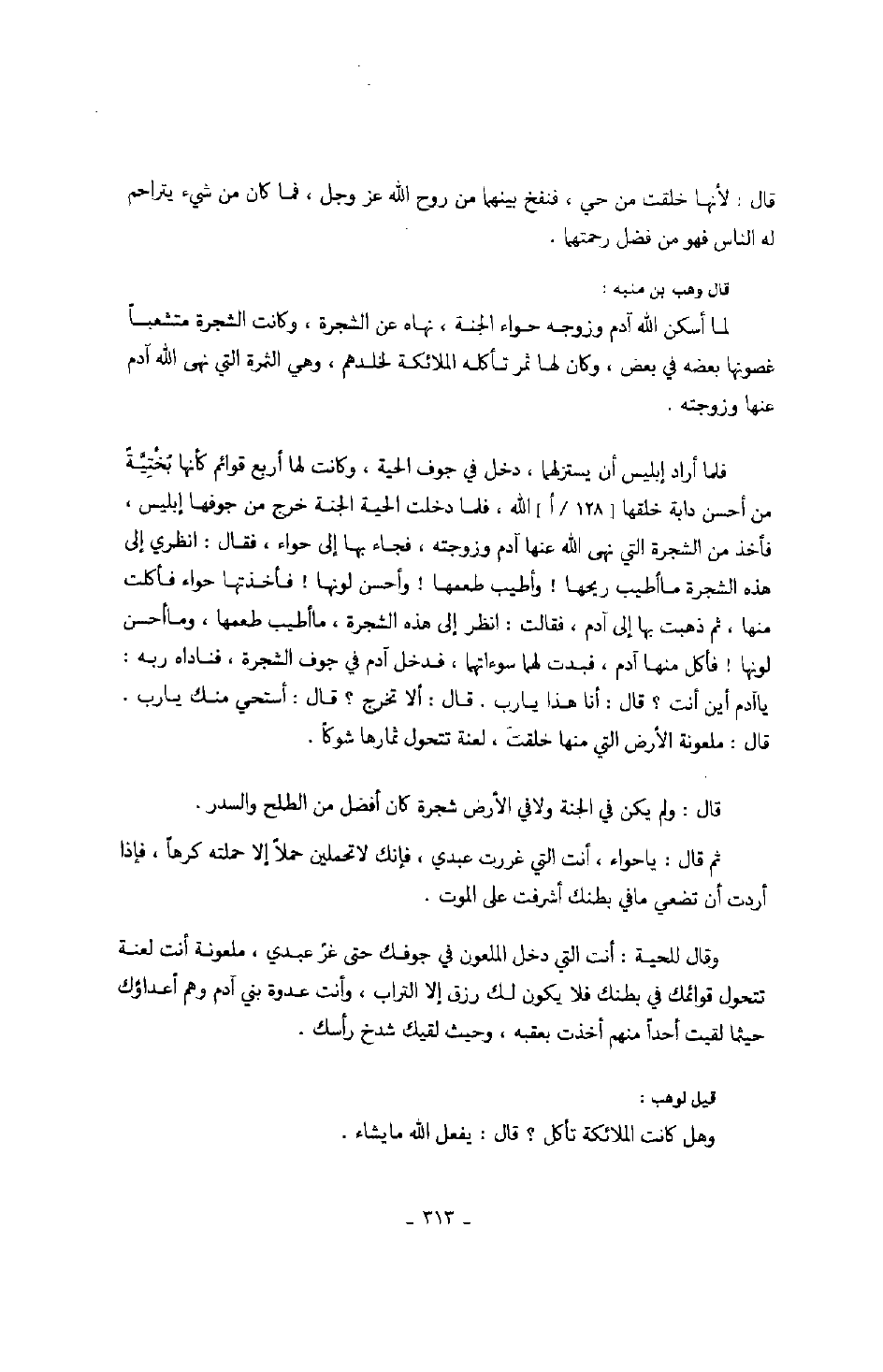 فقالت: نعم، ففغرت فاها فاحتملته بين شدقيها ثم دخلت الجنة، فجاءت الحية إلى حواء، فقالت لها: وإبليس يقول لها على لسان الحية، يا حواء، ما نهاكما ربكما في الجنة؟ قالت: شجرة أمرنا ألا نقربها. قال: فأين تلك الشجرة؟ قالت: إنما علم بذلك آدم،