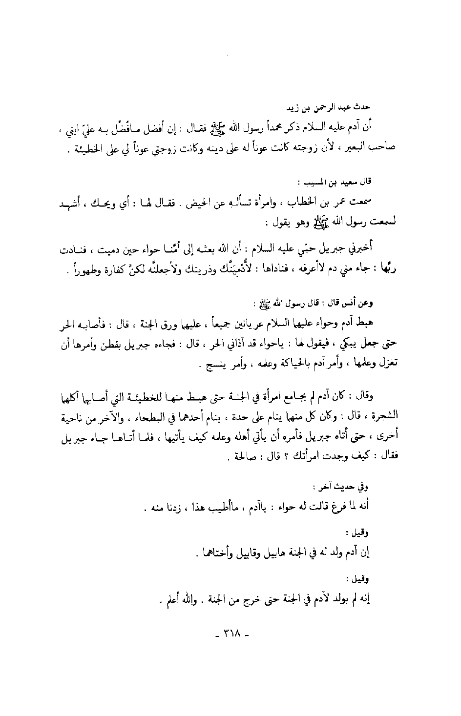 قيل: إن آدم لما مات ابنه قال: يا حواء مات ابنك، وما الموت؟ قال: لا يأكل، ولا يشرب ولا يقوم ولا يمشي ولا يتكلم أبداً، قال: فصاحت حواء فقال آدم: عليك الرنة وعلى بناتك، وأنا وبني منها براء.