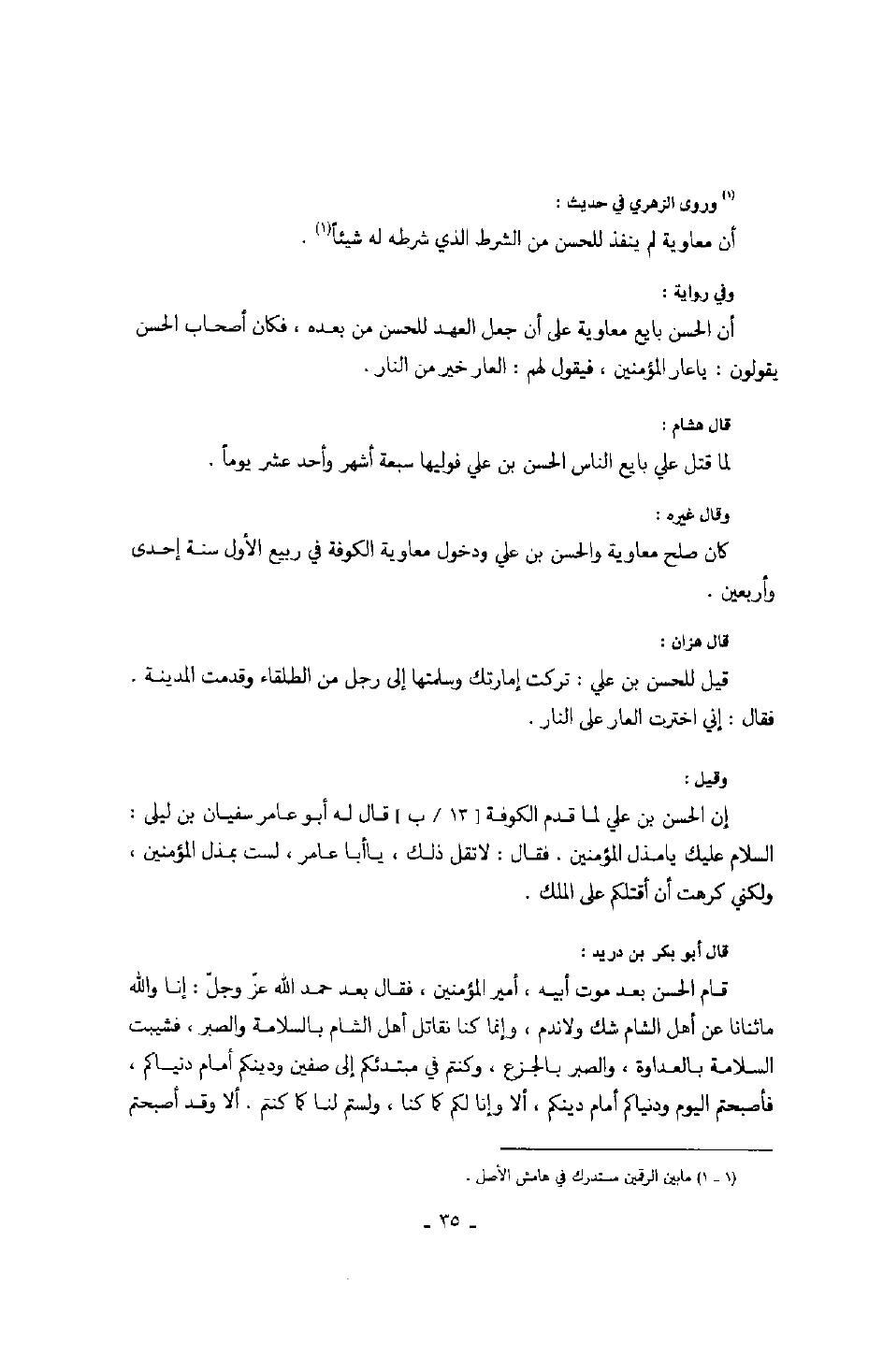 وقيل: إن الحسن بن علي لما قدم الكوفة قال له أبو عامر سفيان بن ليلى: السلام عليك يا مذل المؤمنين. فقال: لا تقل ذلك، يا أبا عامر، لست بمذل المؤمنين، ولكني كرهت أن أقتلكم على الملك.