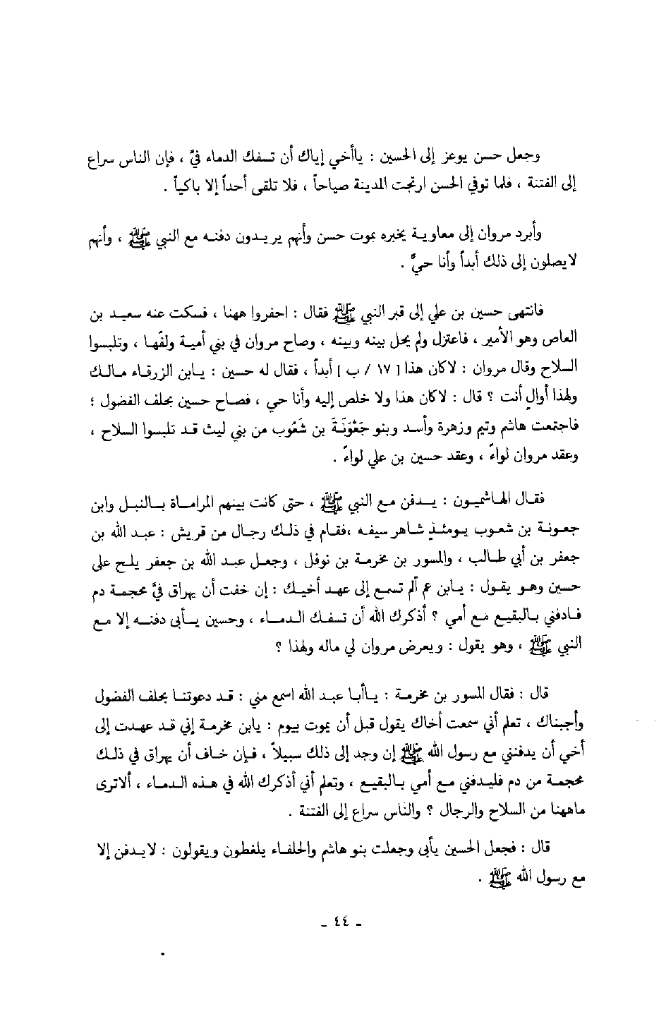 فقال الهاشميون: يدفن مع النبي صَلَّى اللهُ عَلَيْهِ وَسَلَّمَ، حتى كانت بينهم المراماة بالنبل وابن جعونة بن شعوب يومئذ شاهر سيفه، فقام في ذلك رجال من قريش: عبد الله بن جعفر بن أبي طالب، والمسور بن مخرمة بن نوفل، وجعل عبد الله بن جعفر يلح على حسين وهو يقول: يا بن عم ألم تسمع إلى عهد أخيك: إن خفت أن يهراق في محجمة دم فادفني بالبقيع مع أمي؟ أذكرك الله أن تسفك الدماء، وحسين يأبى دفنه إلا مع النبي صَلَّى اللهُ عَلَيْهِ وَسَلَّمَ، وهو يقول: ويعرض مروان لي ماله ولهذا؟
