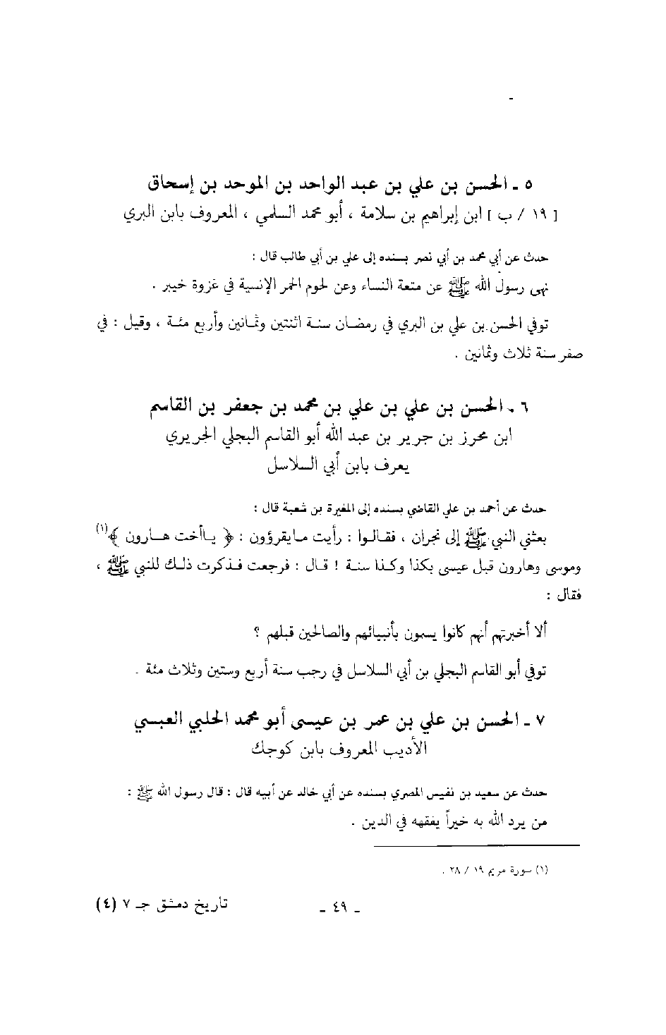 ابن الموحد بن إسحاق بن إبراهيم بن سلامة أبو محمد السلمي المعروف بابن البري حدث عن أبي محمد بن أبي نصر بسنده إلى علي بن أبي طالب قال: نهى رسول الله صَلَّى اللهُ عَلَيْهِ وَسَلَّمَ عن متعة النساء وعن لحوم الحمر الإنسية في غزوة خيبر.