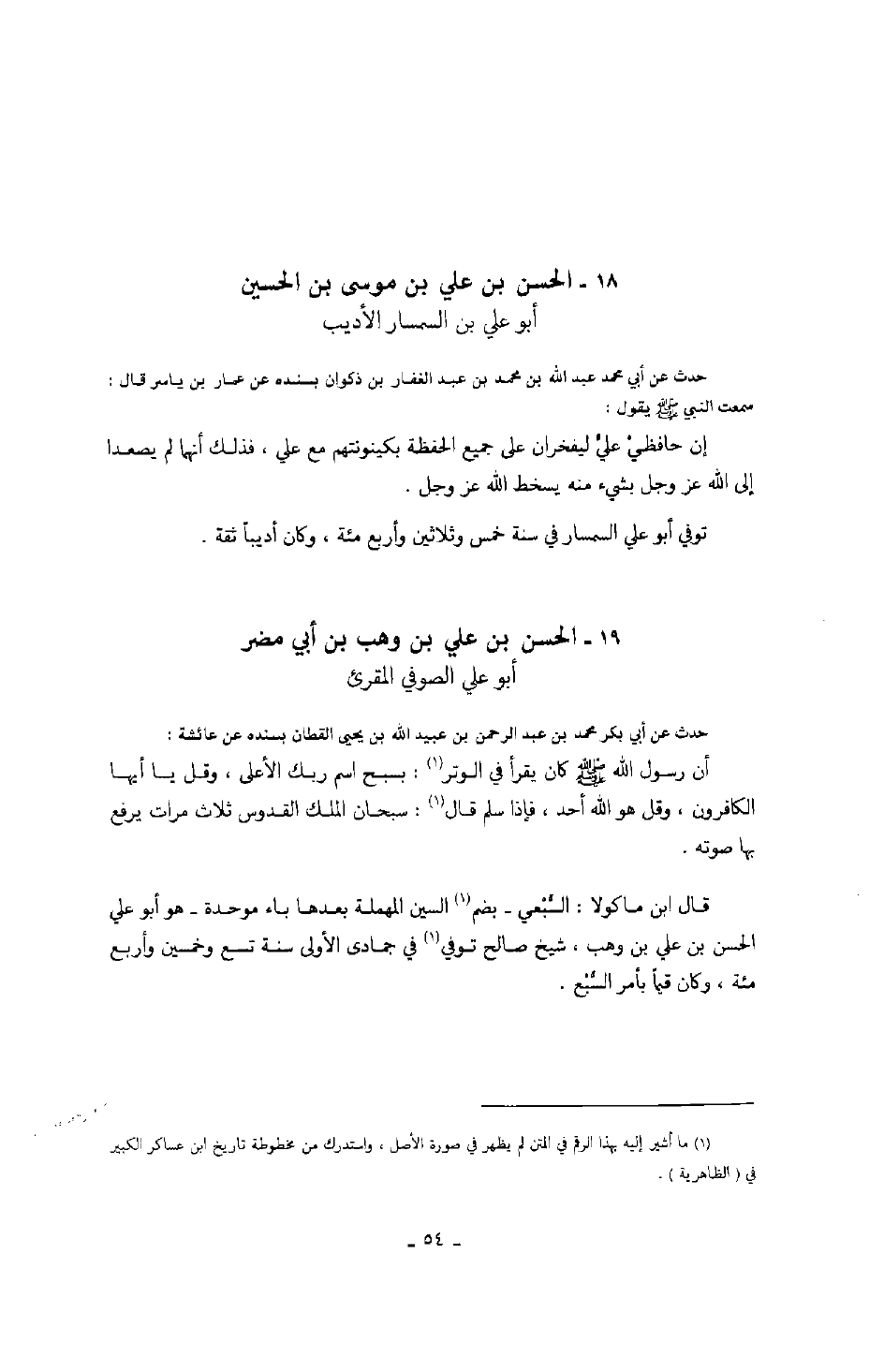 أبو علي بن السمسار الأديب حدث عن أبي محمد عبد الله بن محمد بن عبد الغفار بن ذكوان بسنده عن عمار بن ياسر قال: سمعت النبي صَلَّى اللهُ عَلَيْهِ وَسَلَّمَ يقول: إن حافظي علي ليفخران على جميع الحفظة بكينونتهم مع علي، فذلك أنهما لم يصعدا إلى الله عز وجل بشيء منه يسخط الله عز وجل.