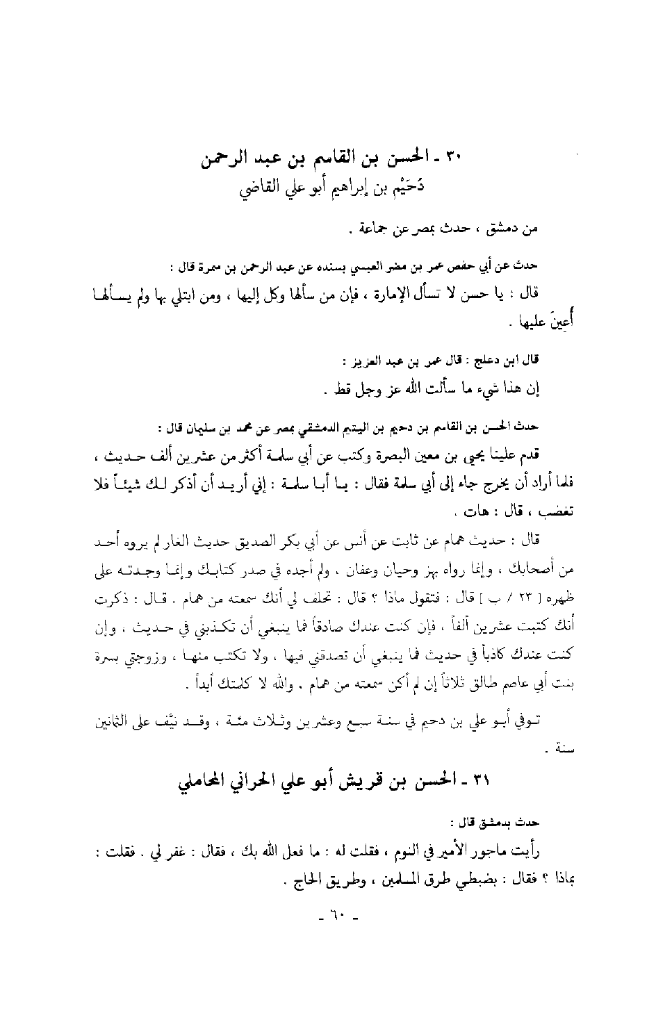 حدث عن أبي حفص عمر بن مضر العبسي بسنده عن عبد الرحمن بن سمرة قال: قال: يا حسن لا تسأل الإمارة، فإن من سألها وكل إليها، ومن ابتلي بها ولم يسألها أعين عليها.