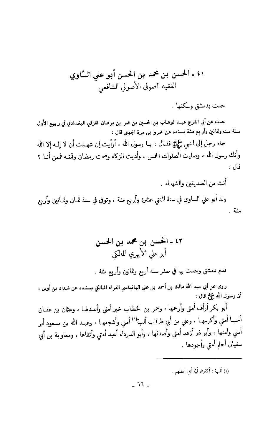 حدث عن أبي الفرج عبد الوهاب بن الحسين بن عمر بن برهان الغزالي البغدادي في ربيع الأول سنة ست وثمانين وأربع مئة بسنده عن عمرو بن مرة الجهني قال: جاء رجل إلى النبي صَلَّى اللهُ عَلَيْهِ وَسَلَّمَ فقال: يا رسول الله، أرأيت إن شهدت أن لا إله إلا الله وأنك رسول الله، وصليت الصلوات الخمس، وأديت الزكاة وصمت رمضان وقمته فممن أنا؟ قال: أنت من الصديقين والشهداء.
